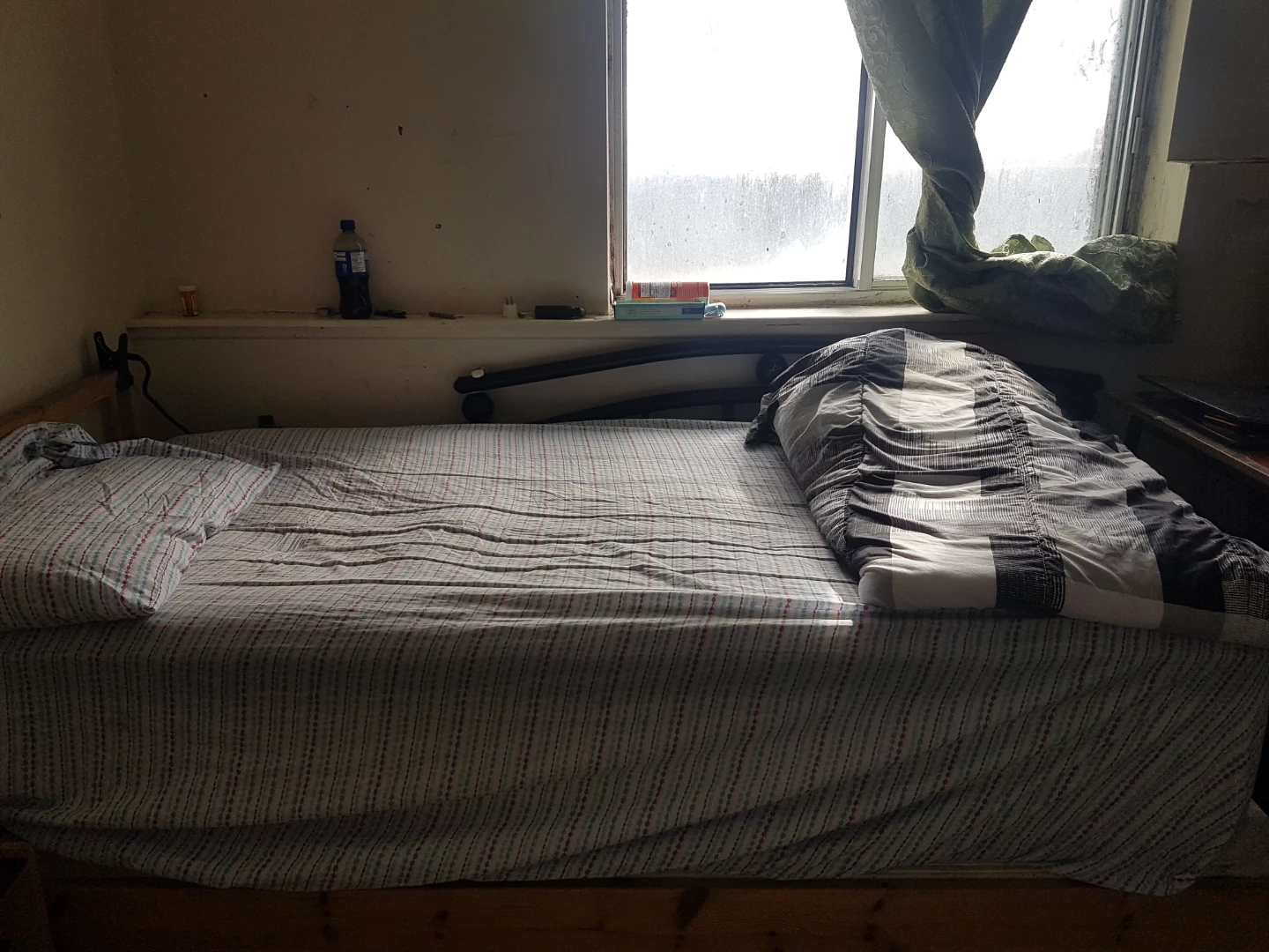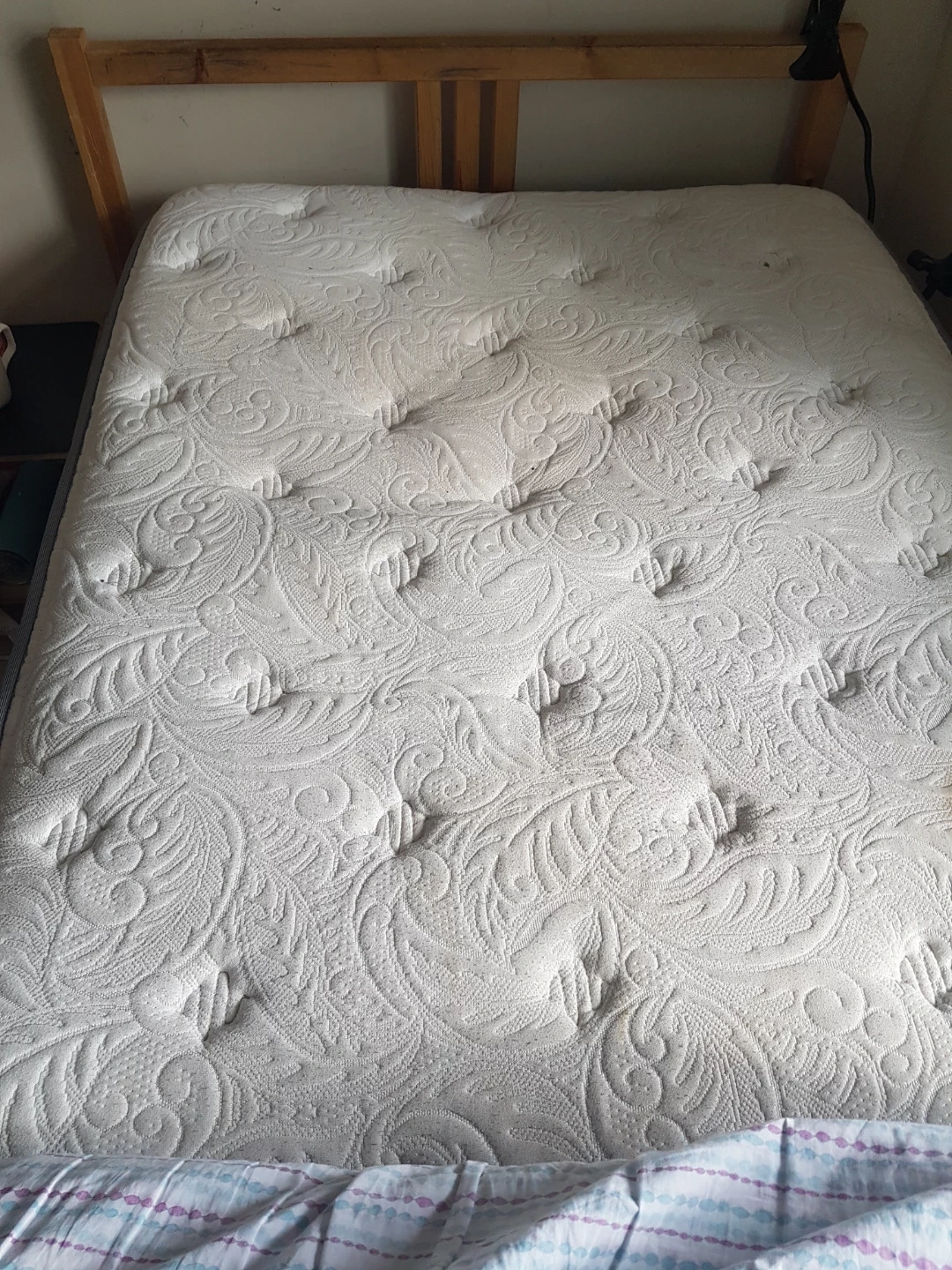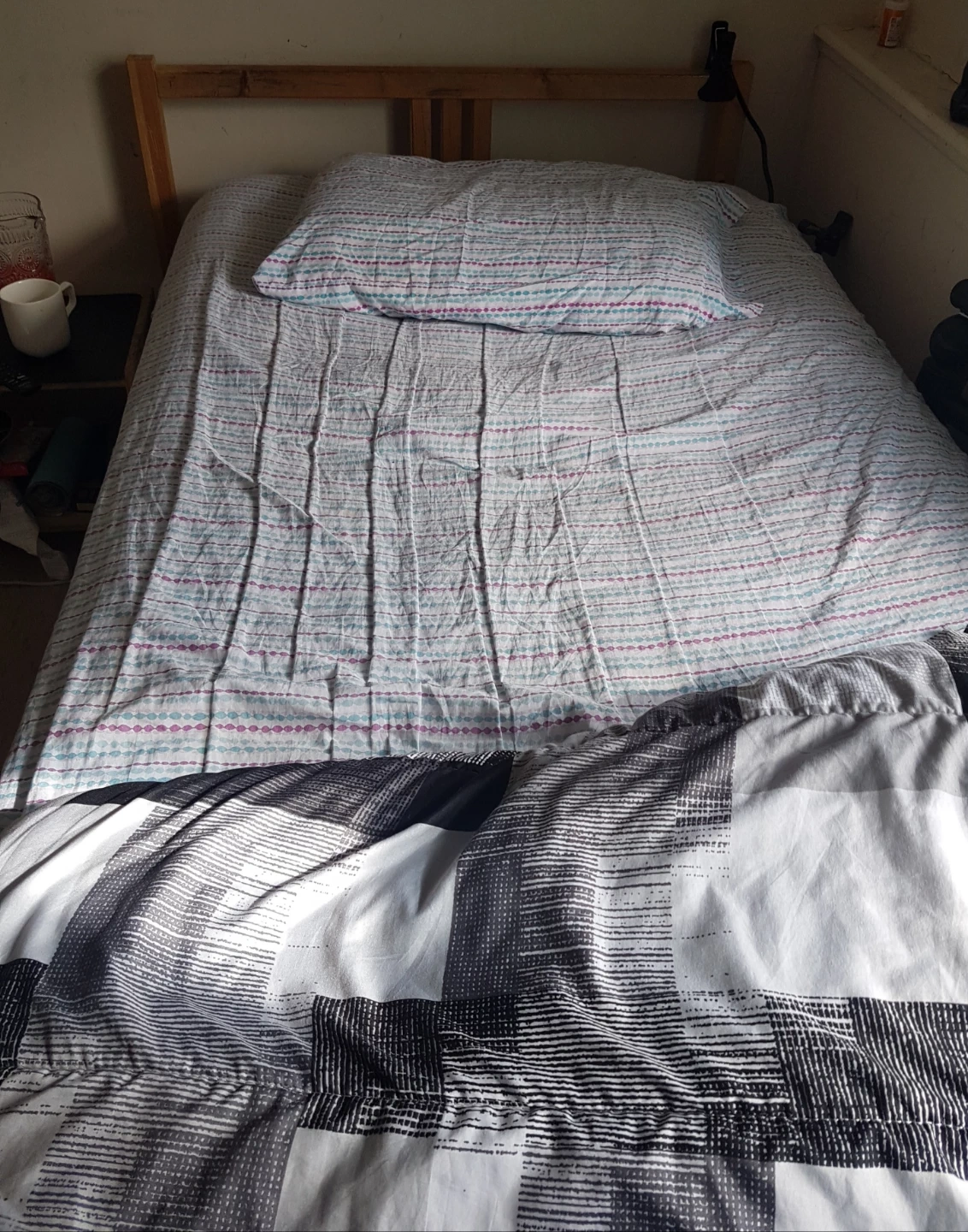 Wooden single bed frame complete with a quilted mattress. Includes pillow and striped duvet cover. Bedding is clean and ready for use. Great for a first apartment or guest room!