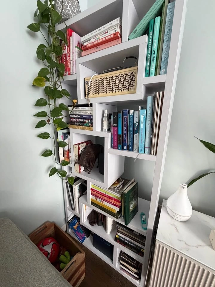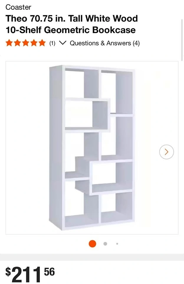 Beautiful white bookcase with a geometric design. It's 70.75” tall and has 10 shelves, making it a great space-saving option. The construction is high-quality and much sturdier than basic shelves. Perfect for books, plants, décor, or general storage. It's in excellent condition. Retails for $211. Price: $150 or best offer. Pickup only.