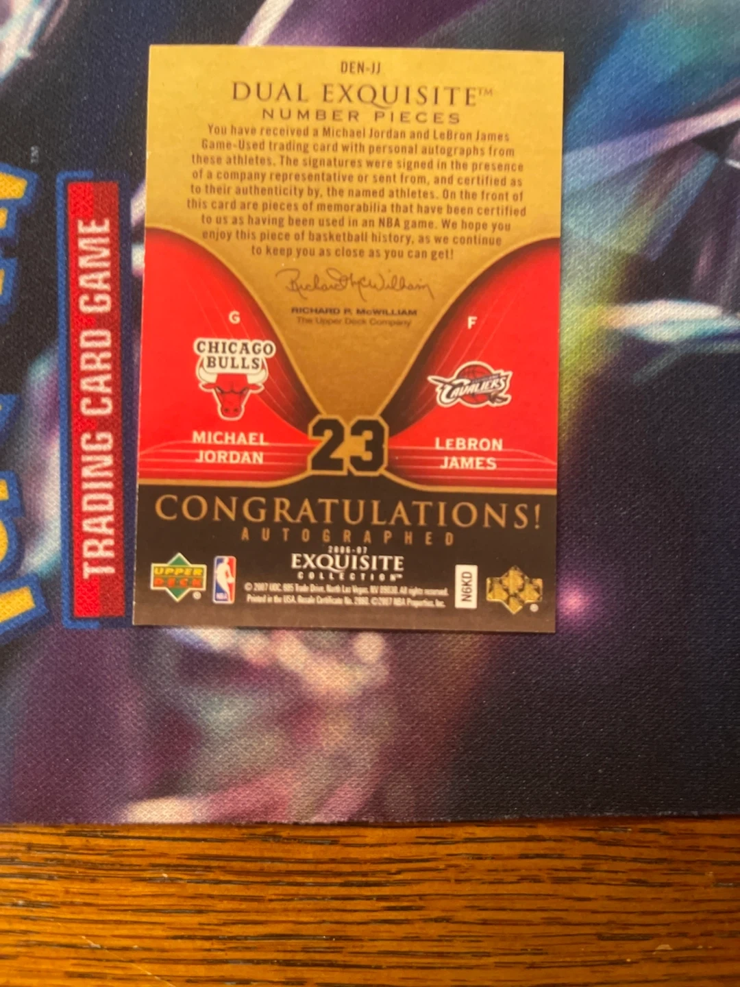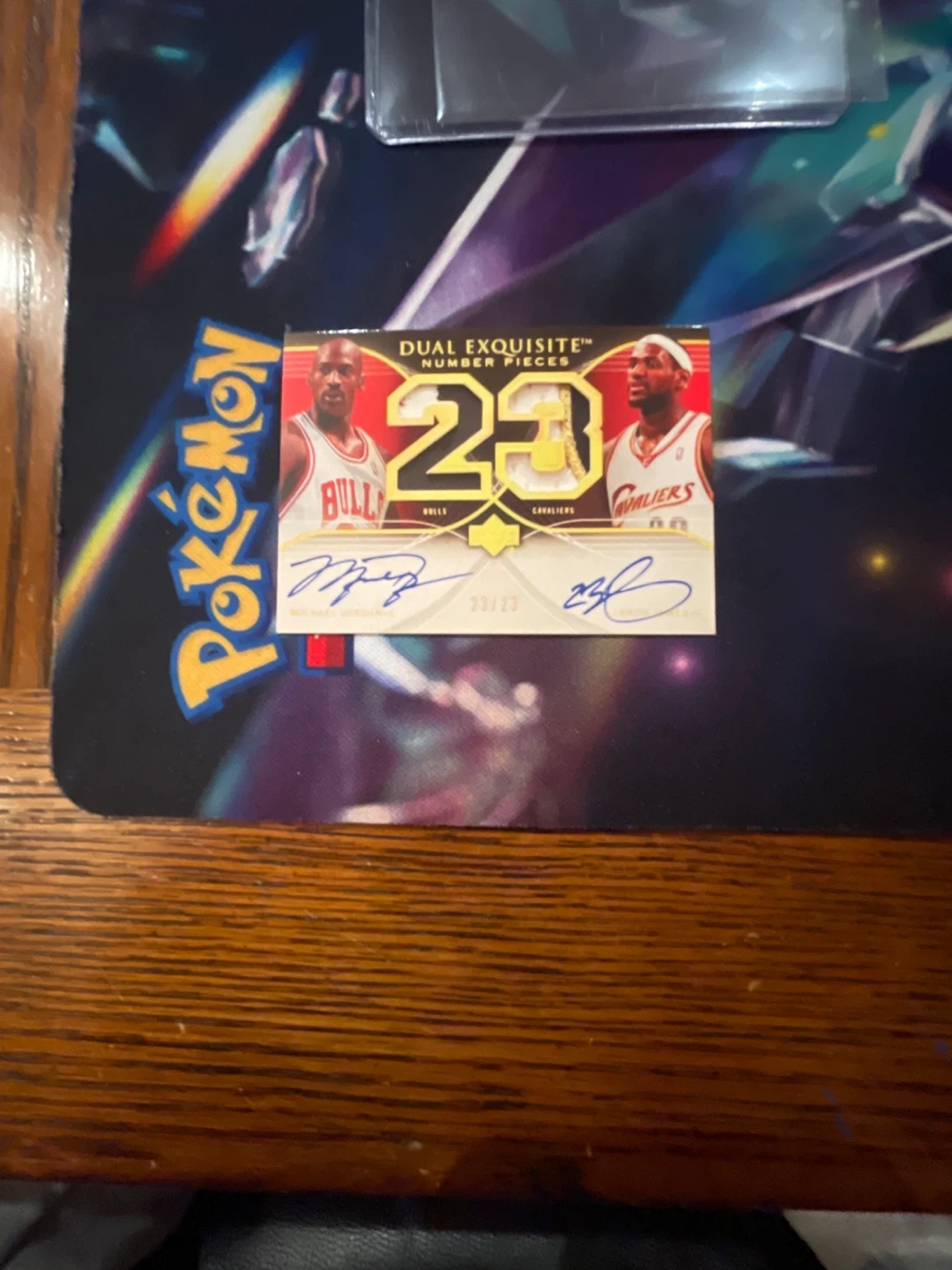 This is an autographed trading card featuring Michael Jordan and LeBron James from Upper Deck's Dual Exquisite collection. It's a limited edition piece, numbered 23/23