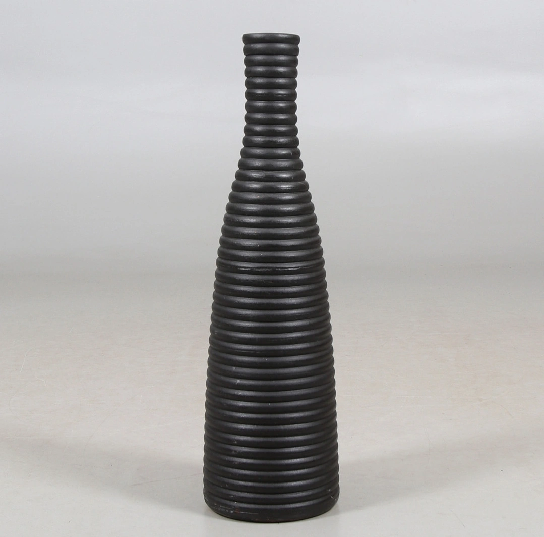 A tall, matte black vase with a distinctive ribbed texture. It's made of ceramic. This vase would look great on its own or with dried flowers.