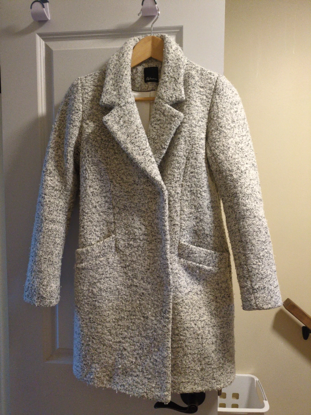 This tweed coat features a classic collar and two front pockets. It's made with a textured blend fabric for a stylish look. Perfect for layering during cooler weather!