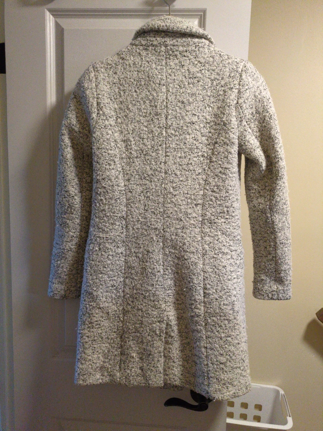 This tweed coat features a classic collar and two front pockets. It's made with a textured blend fabric for a stylish look. Perfect for layering during cooler weather!