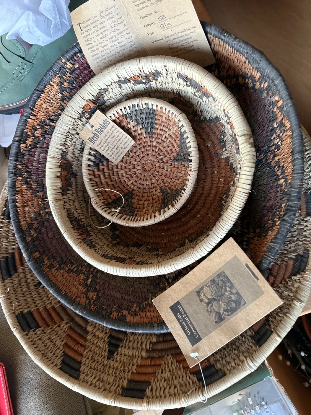 This set includes four hand-woven African baskets. Each basket features a unique, intricate pattern. They're ideal for decorative storage or display!