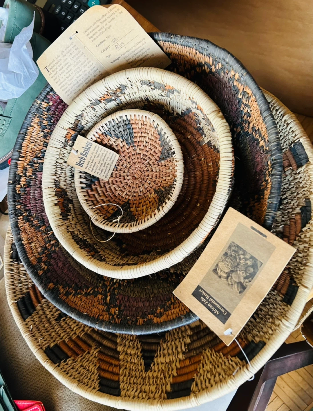 This set includes four hand-woven African baskets. Each basket features a unique, intricate pattern. They're ideal for decorative storage or display!