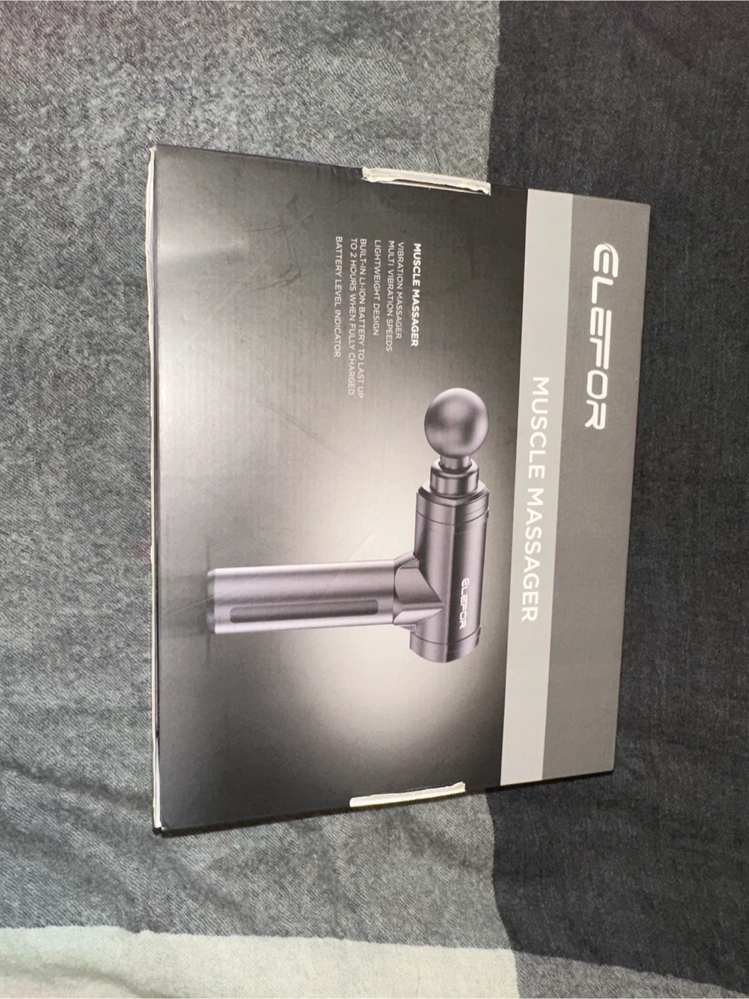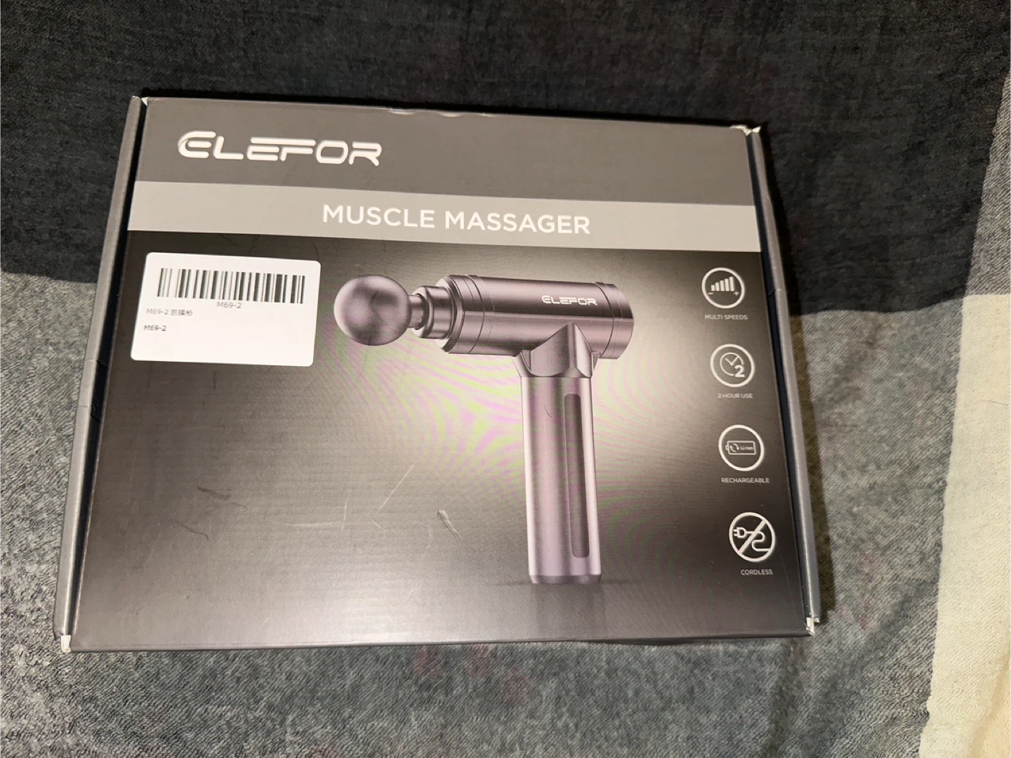 ELEFOR muscle massager with multiple speed settings. It's a vibration massager with a built-in lithium battery offering up to 2 hours of use. Rechargeable and cord-less.