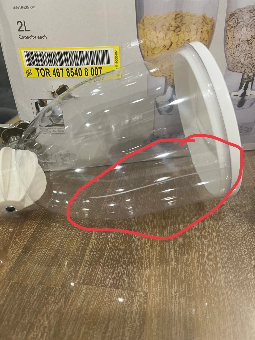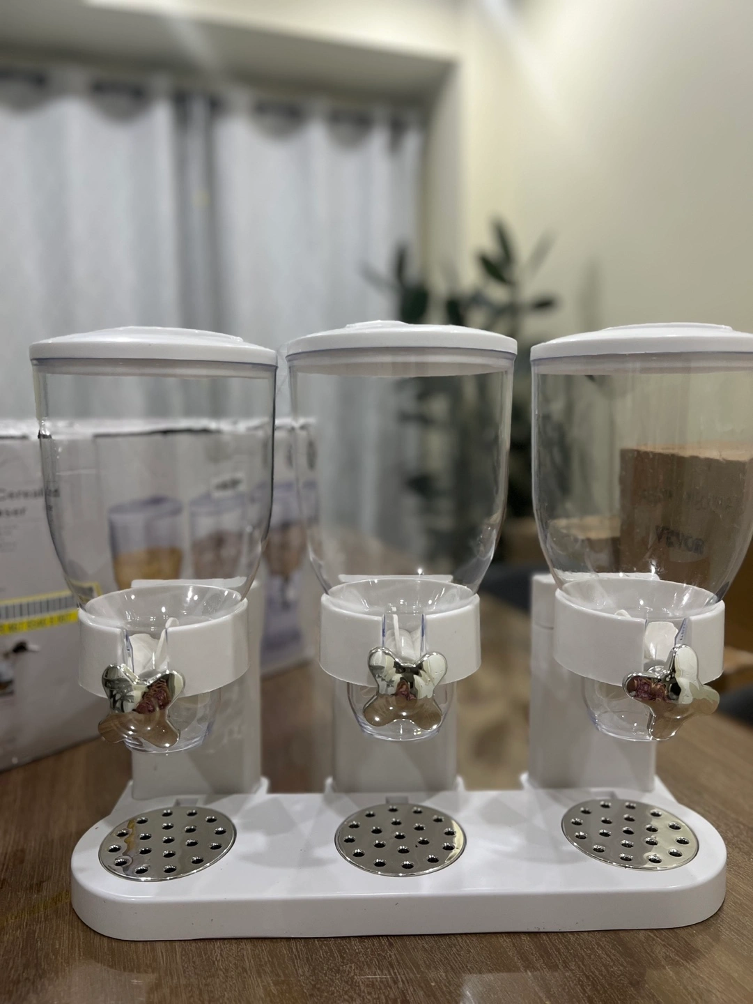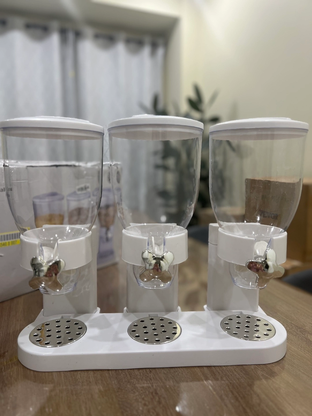 Transparent Dispenser with Secure Rotating Knob. Multipurpose Kitchen Food Dispenser for Nuts, Candies, Cereals. I didn’t use it, it’s almost new but you can see the last picture one of the dispenser container has little crack in the back but it’s not noticeable.