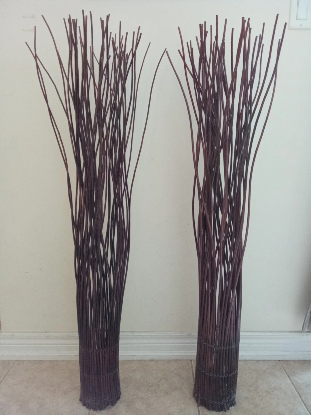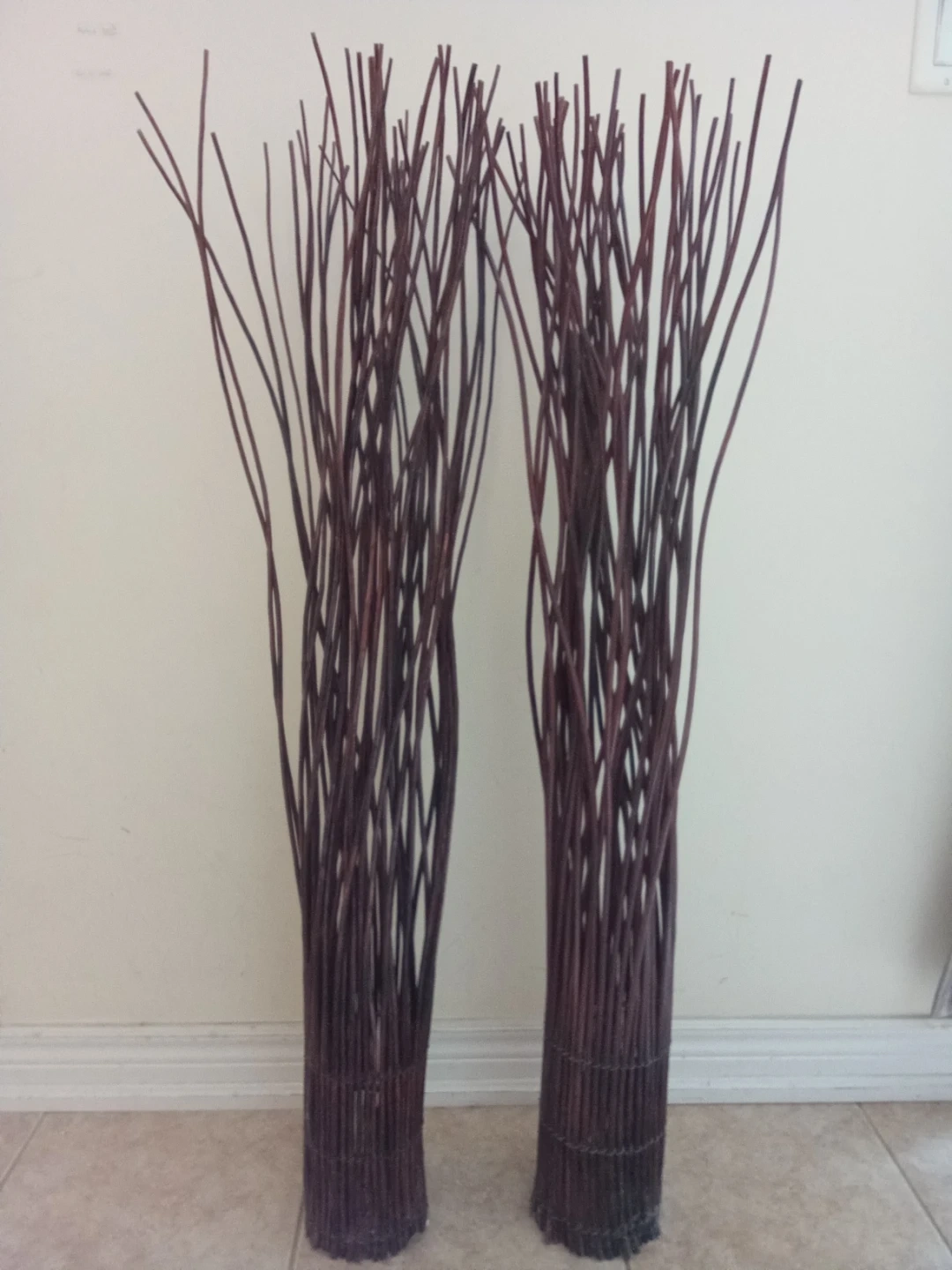Two decorative bundles of dried twigs. They're great for adding a natural accent to your home decor. Bundled with wire at the base for stability.