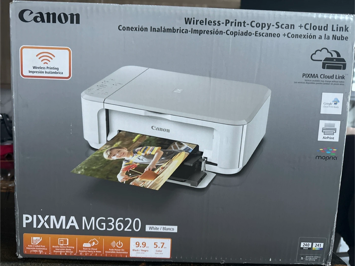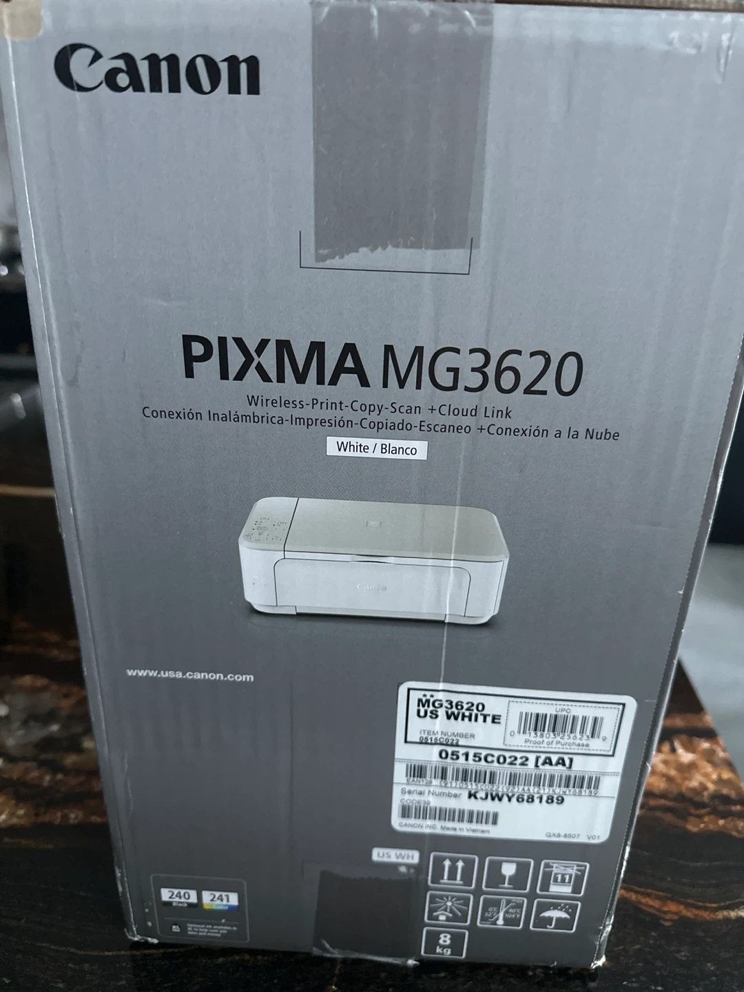 This is a white Canon PIXMA MG3620 printer. It's a wireless print, copy, and scan device with cloud link connectivity. It supports AirPrint and Google Cloud Print.