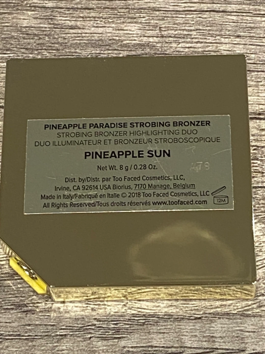 This Too Faced Pineapple Paradise Strobing Bronzer and Highlighting Duo offers two complementary shades. Net Wt. 8 g / 0.28 Oz. Made in Italy.