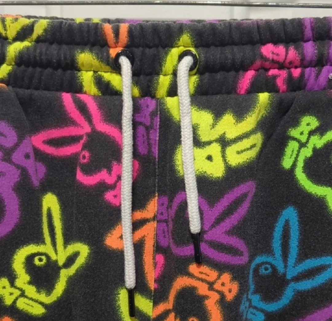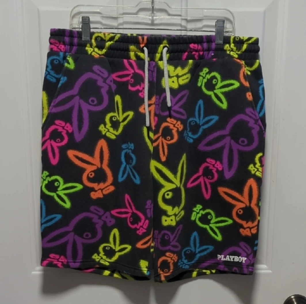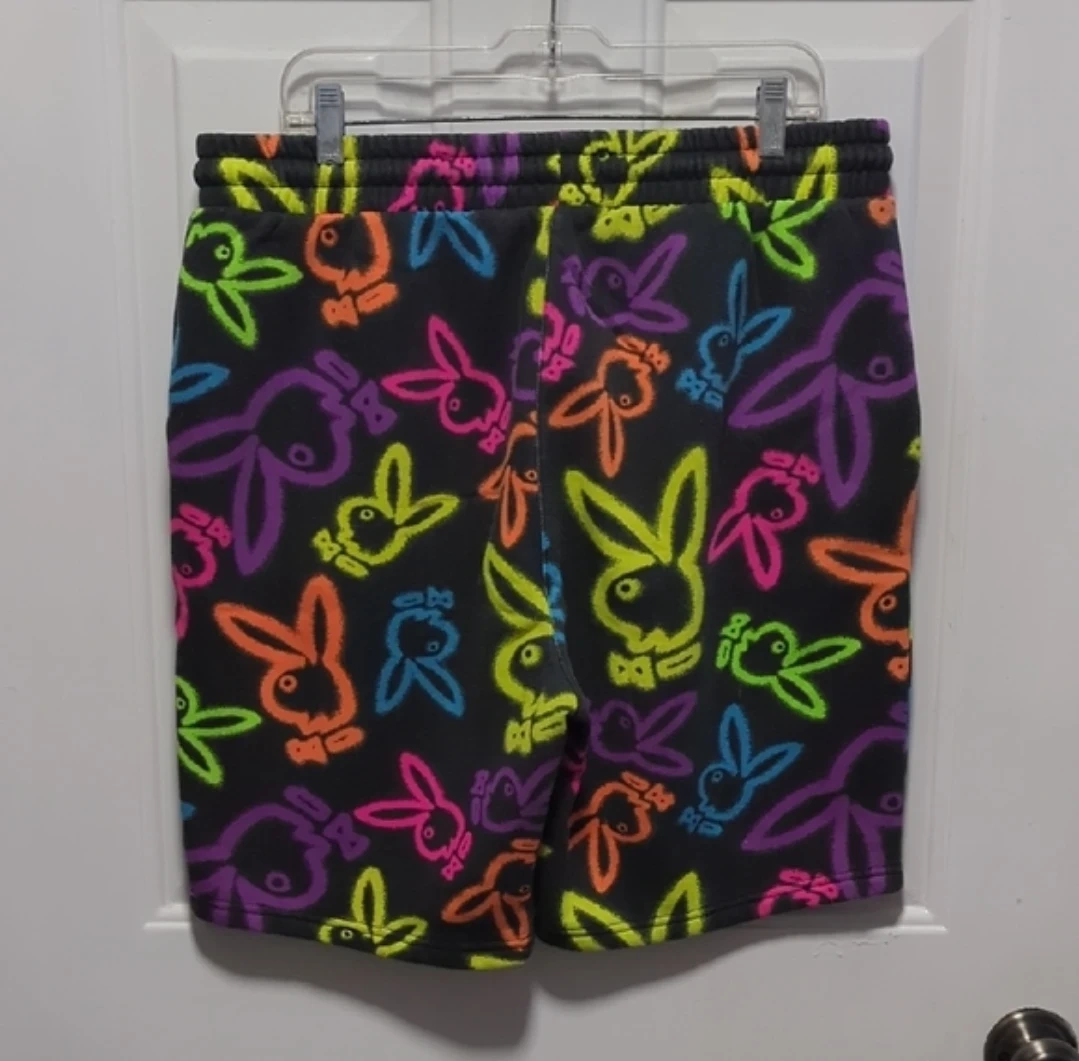 Black shorts featuring a colourful all-over Playboy bunny print. Elastic waistband with drawstring for a comfy fit. These shorts are perfect for lounging or casual wear. Seize XXL