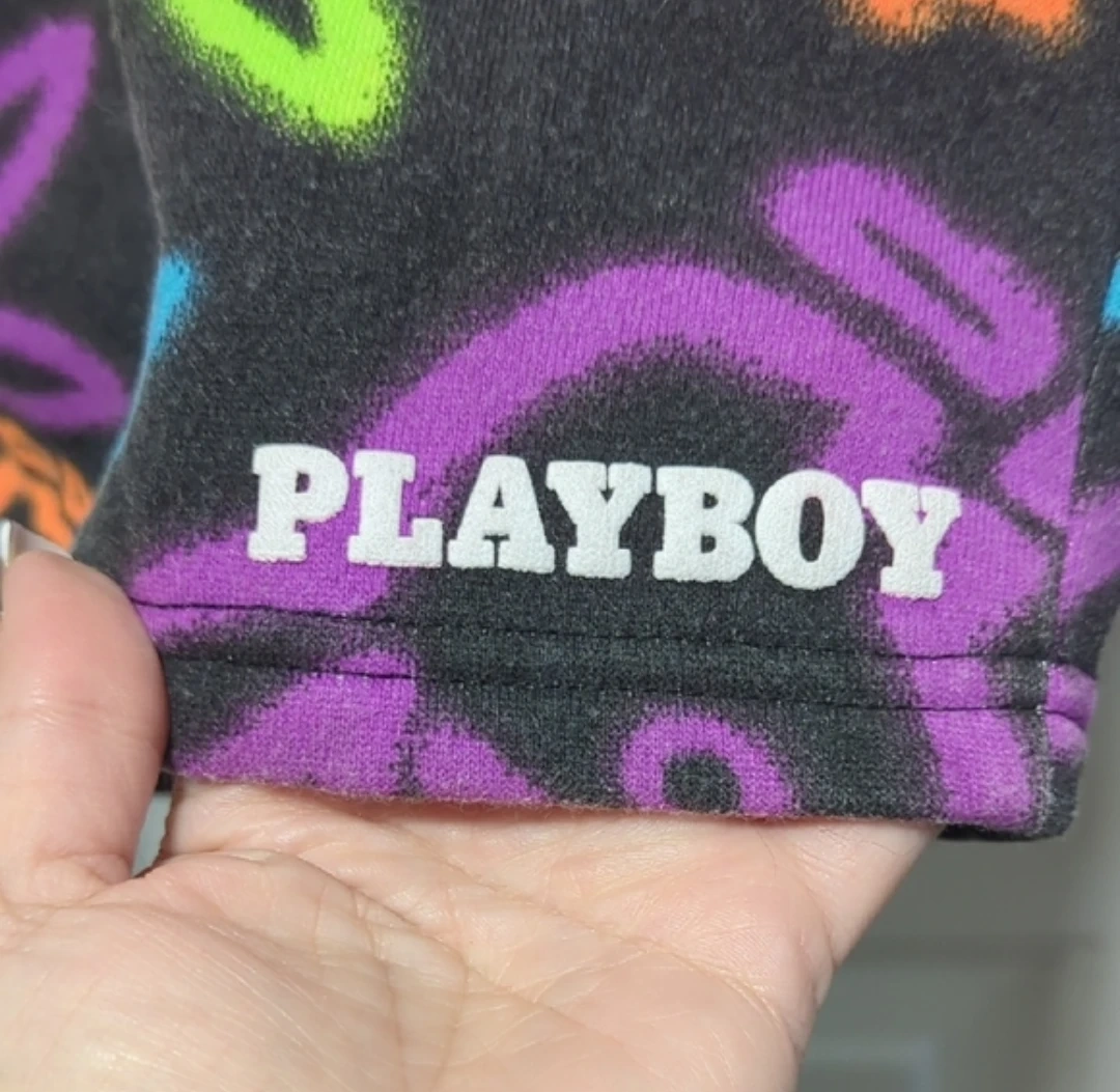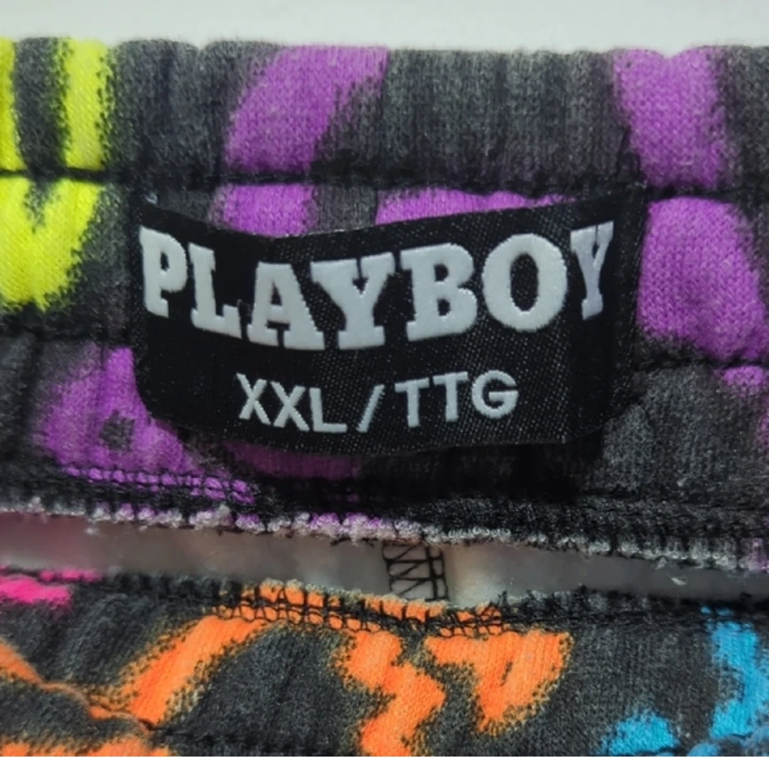 Black shorts featuring a colourful all-over Playboy bunny print. Elastic waistband with drawstring for a comfy fit. These shorts are perfect for lounging or casual wear. Seize XXL