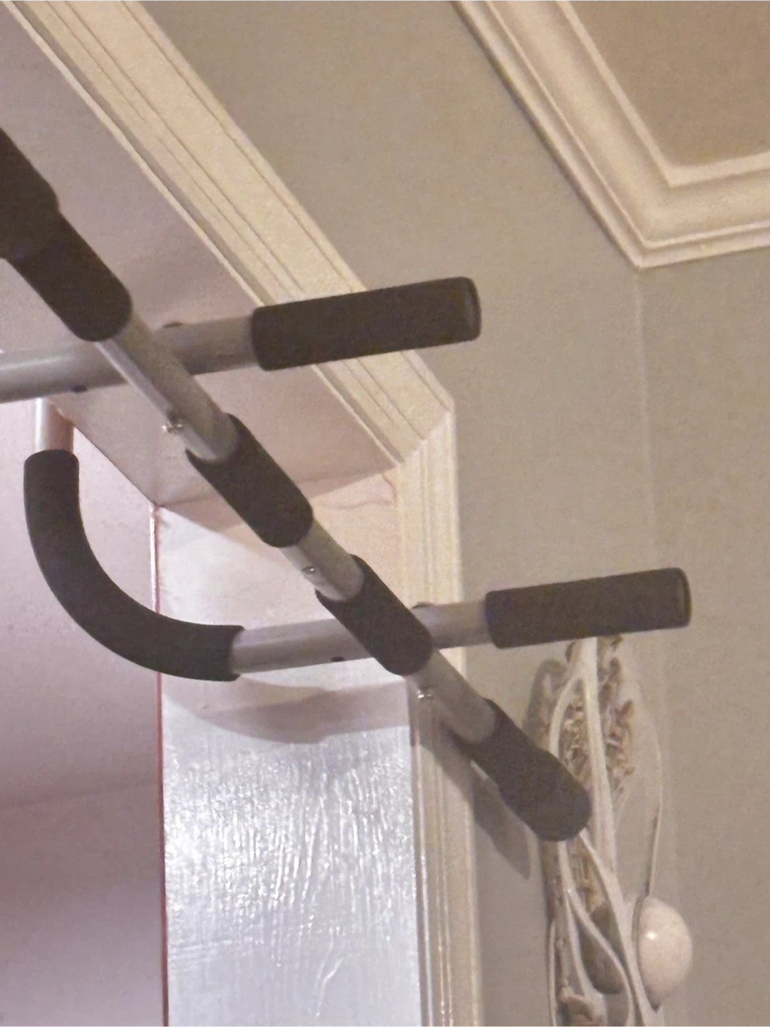 This doorway pull up bar is great for home workouts. It has multiple padded grips for different hand positions. Easily attaches to most standard door frames.