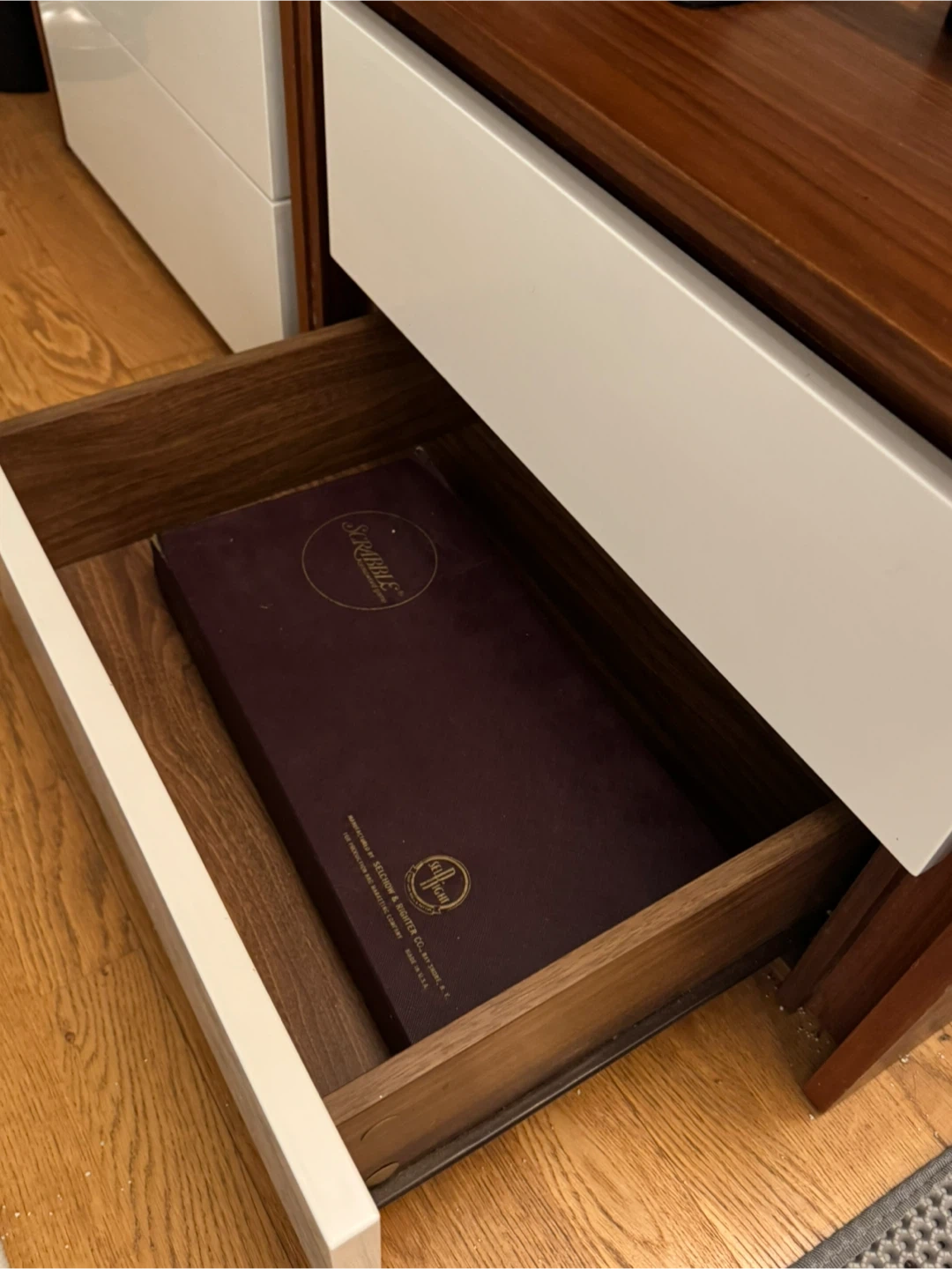 Selling two matching end tables with white drawer fronts. Clean, modern look.