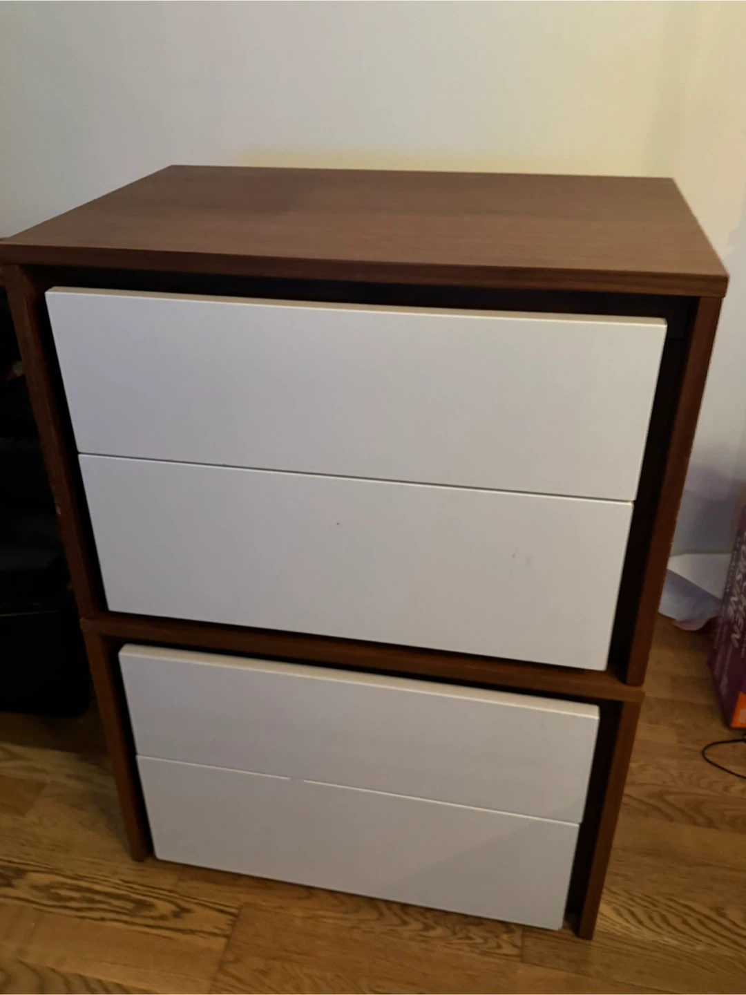 Selling two matching end tables with white drawer fronts. Clean, modern look.