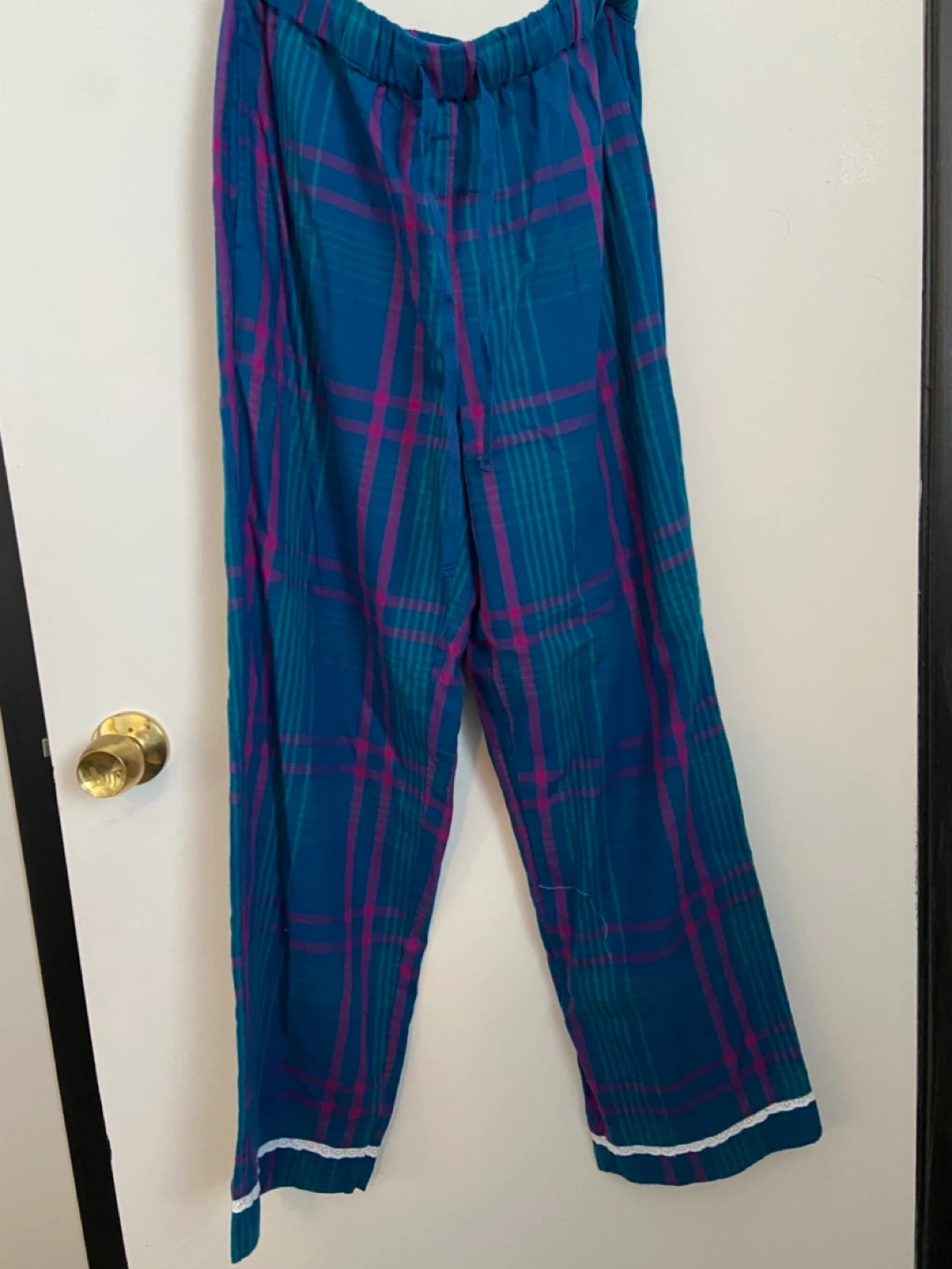 This is a Rachel Ashwell pajama set. It features a button-up top and matching elastic waist pants. The set has a classic plaid pattern with white lace trim. It's comfortable for lounging or sleeping!