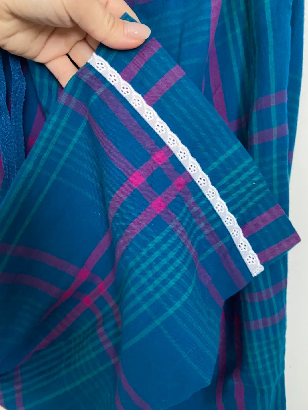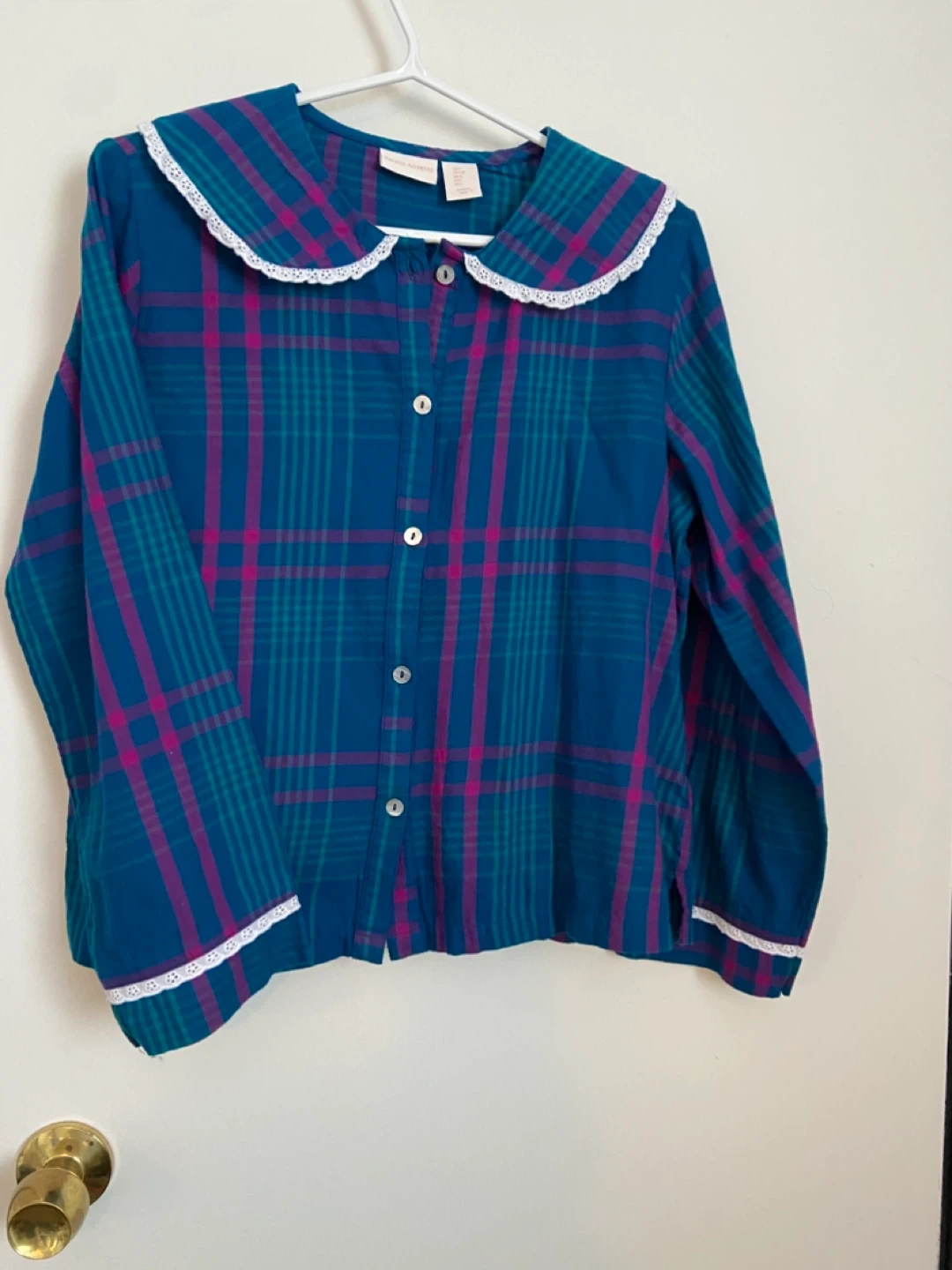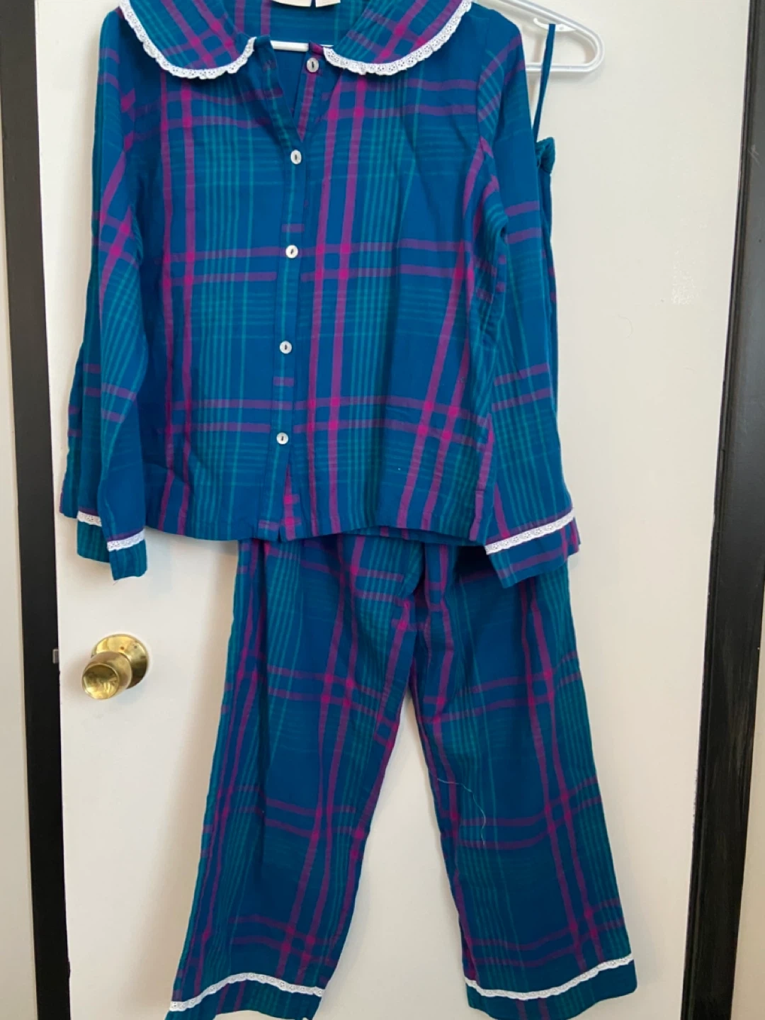 This is a Rachel Ashwell pajama set. It features a button-up top and matching elastic waist pants. The set has a classic plaid pattern with white lace trim. It's comfortable for lounging or sleeping!