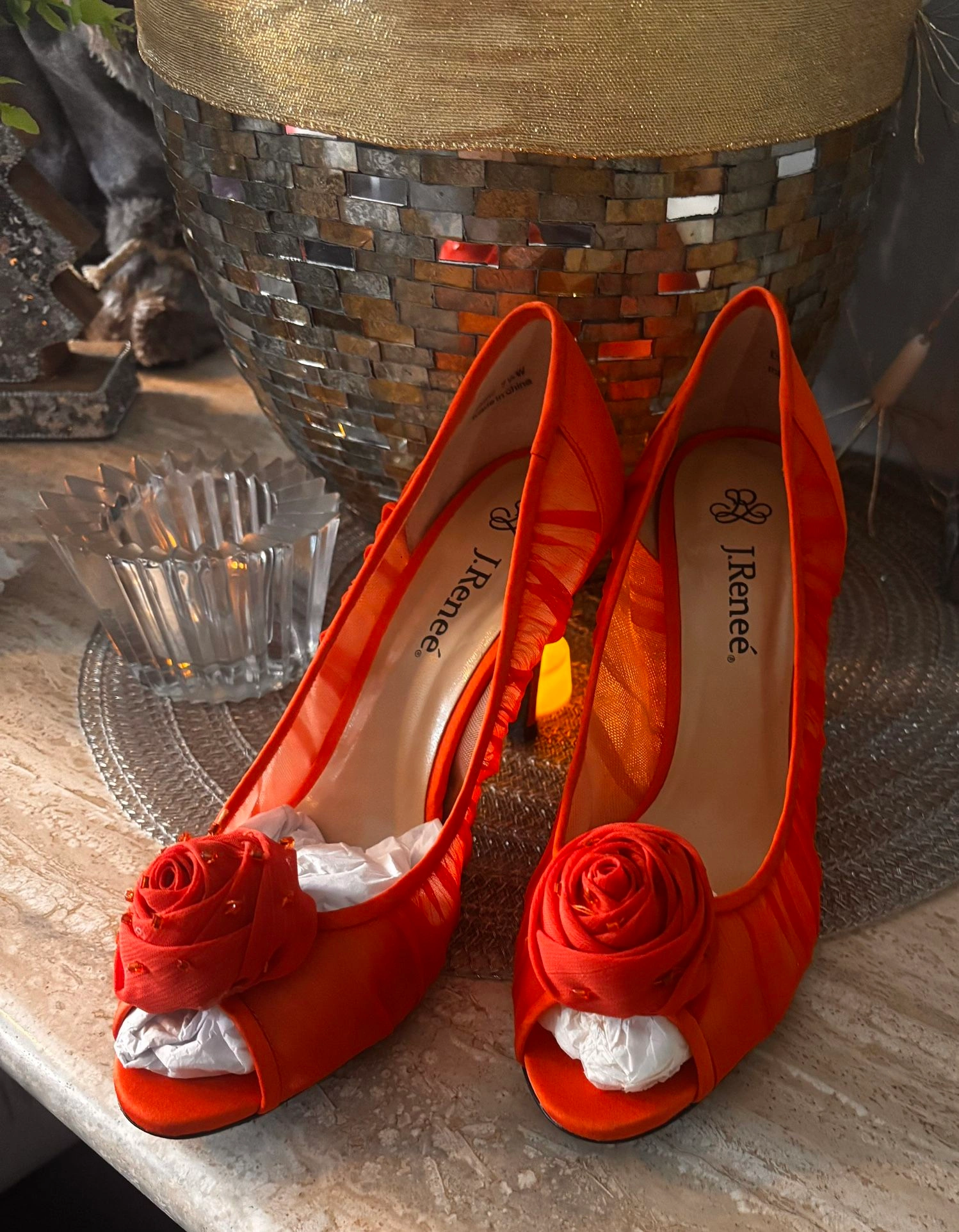 Make a bold and elegant statement with these stunning Renée peep-toe heels in a vibrant orange hue. Designed with a beautiful rosette bow detail at the toe and soft mesh side panels, these heels are both eye-catching and comfortable—perfect for weddings, parties, church, or any special occasion.