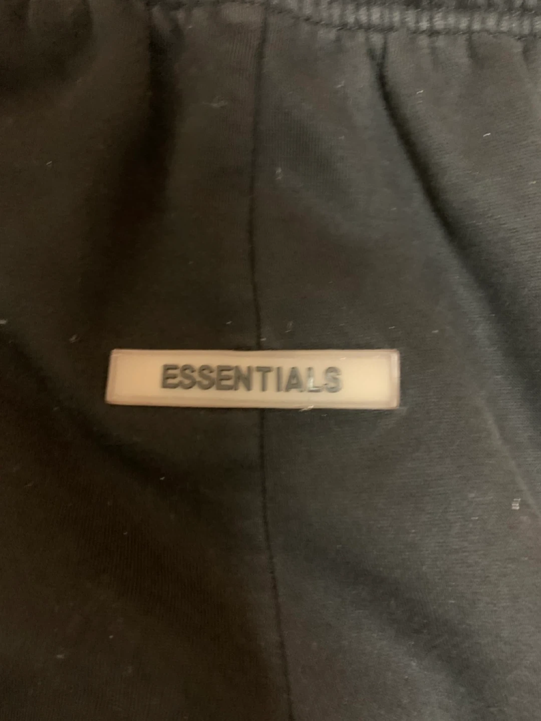 Black sweatpants from Fear of God Essentials. It's made with a comfortable material. These pants are perfect for casual wear.