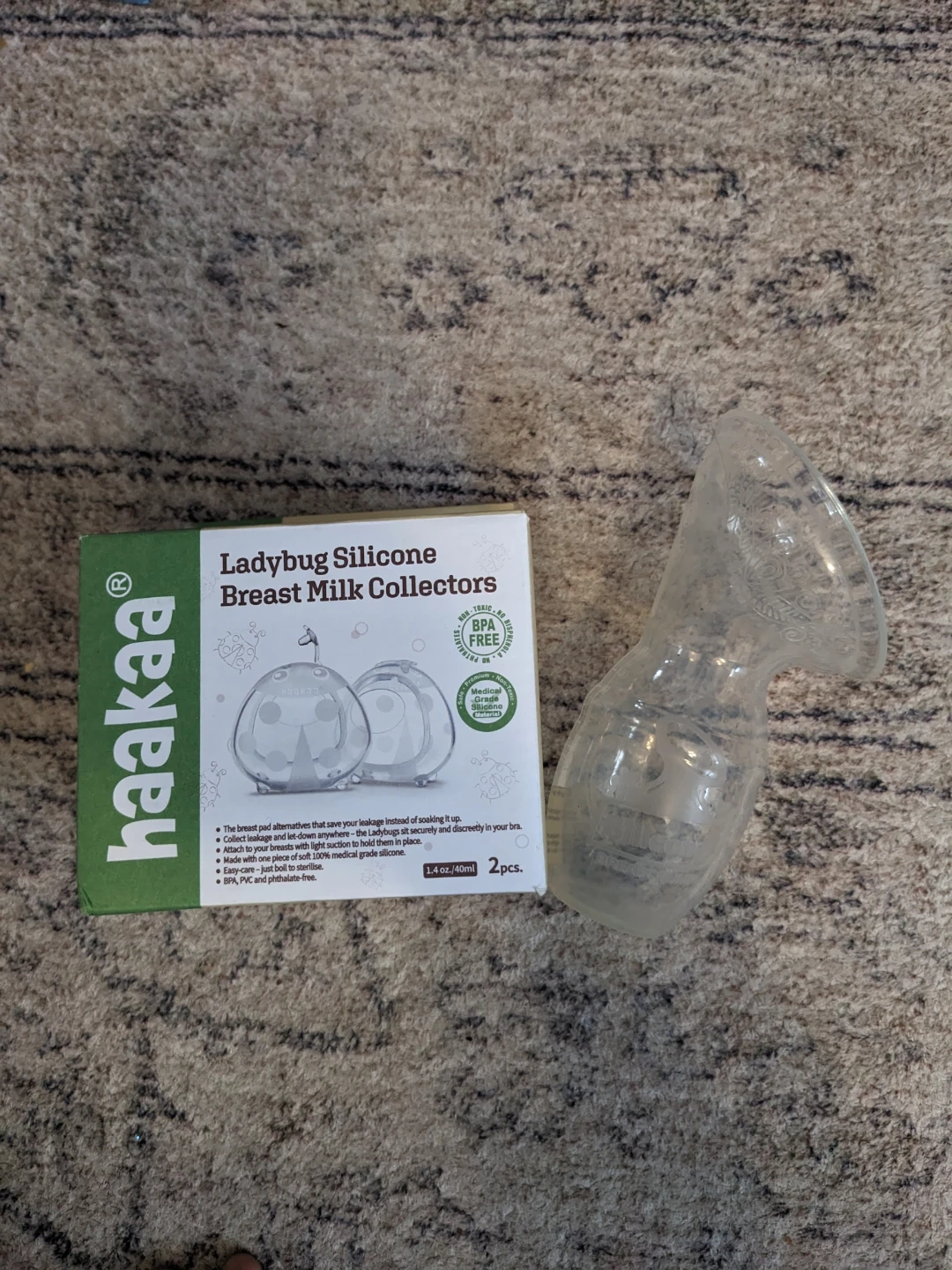 1,Haakaa Ladybug Silicone Breast Milk Collectors. Made of 100% food-grade silicone. BPA, PVC, and phthalate-free. Collects leaky breast milk and protects sore nipples. Pack of two, 1.4oz (40ml) capacity each.