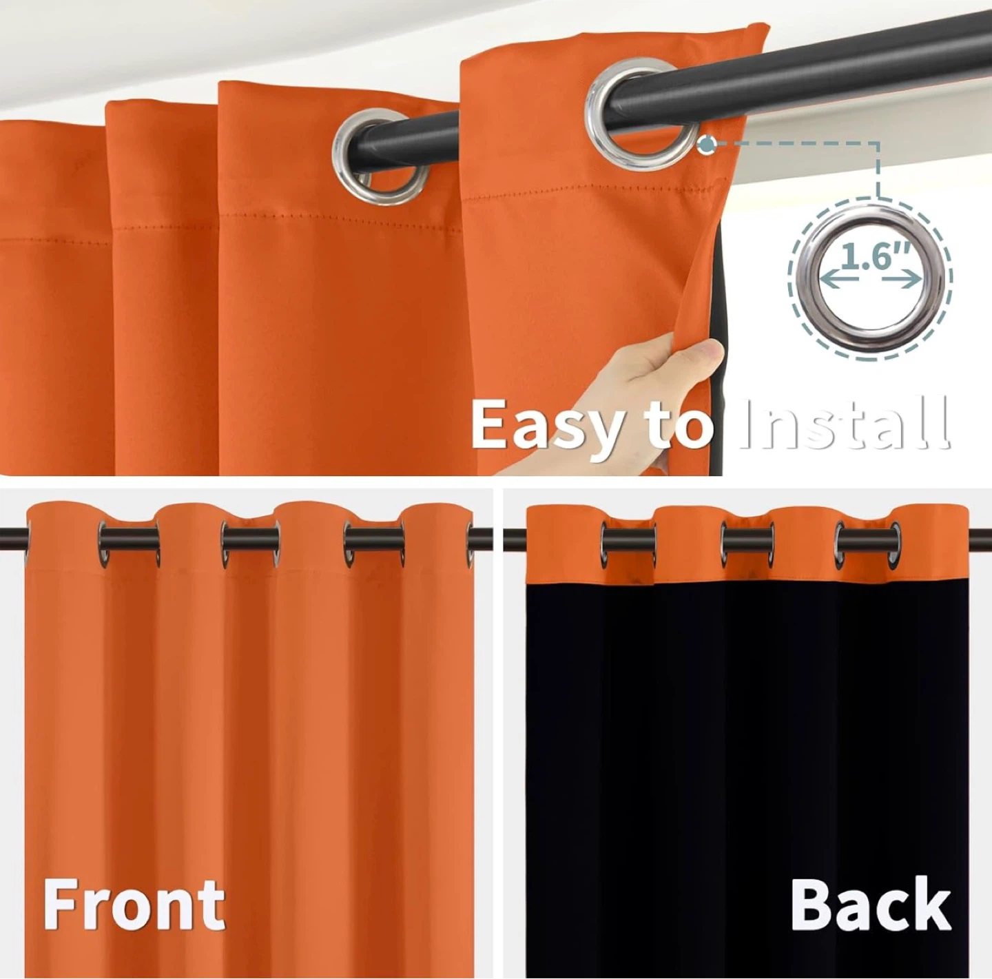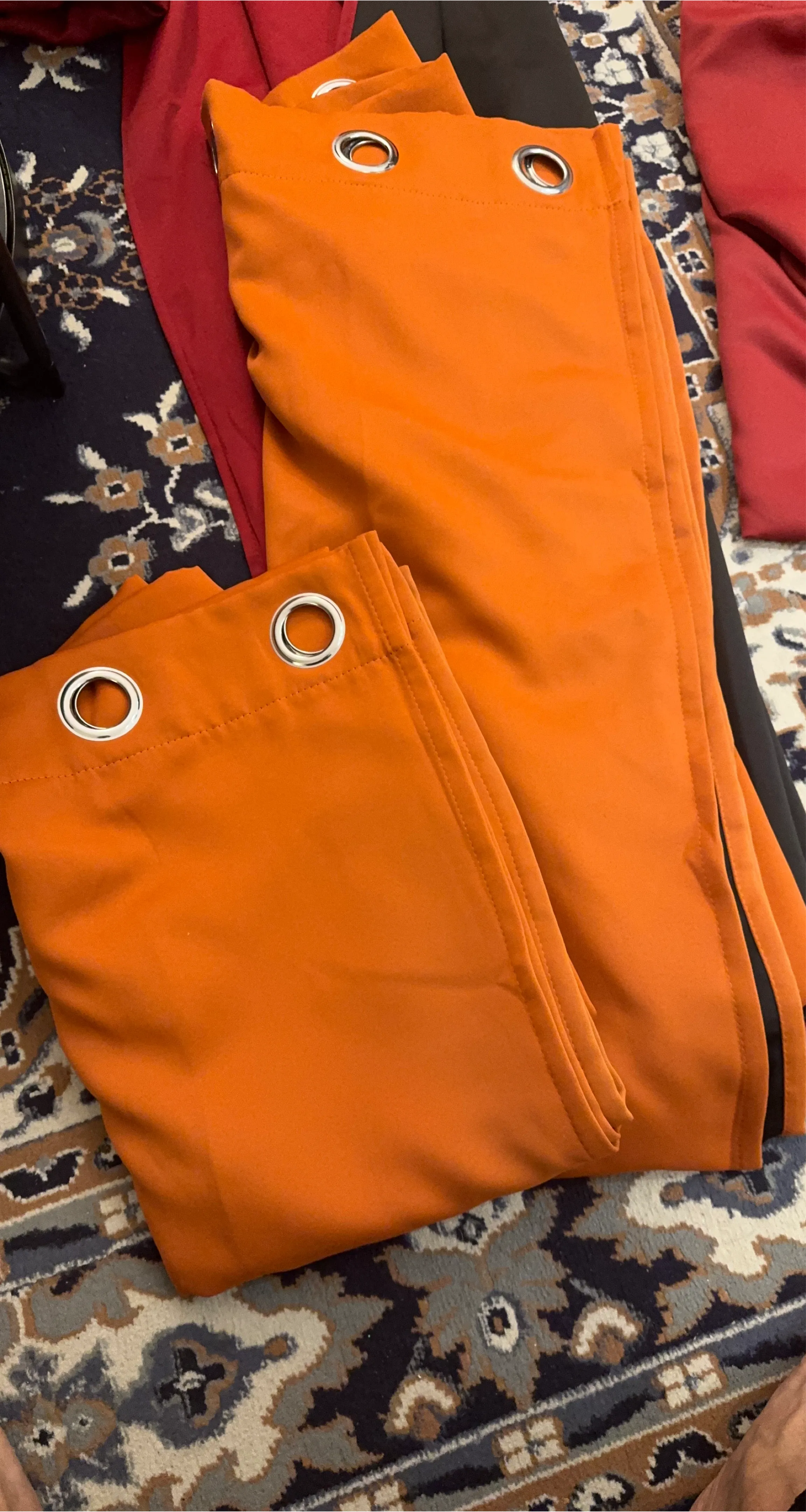 Selling a set of two burnt orange grommet curtains with black paneling. These curtains have a modern design with silver grommets for easy hanging. They're a vibrant color that can brighten up any room!