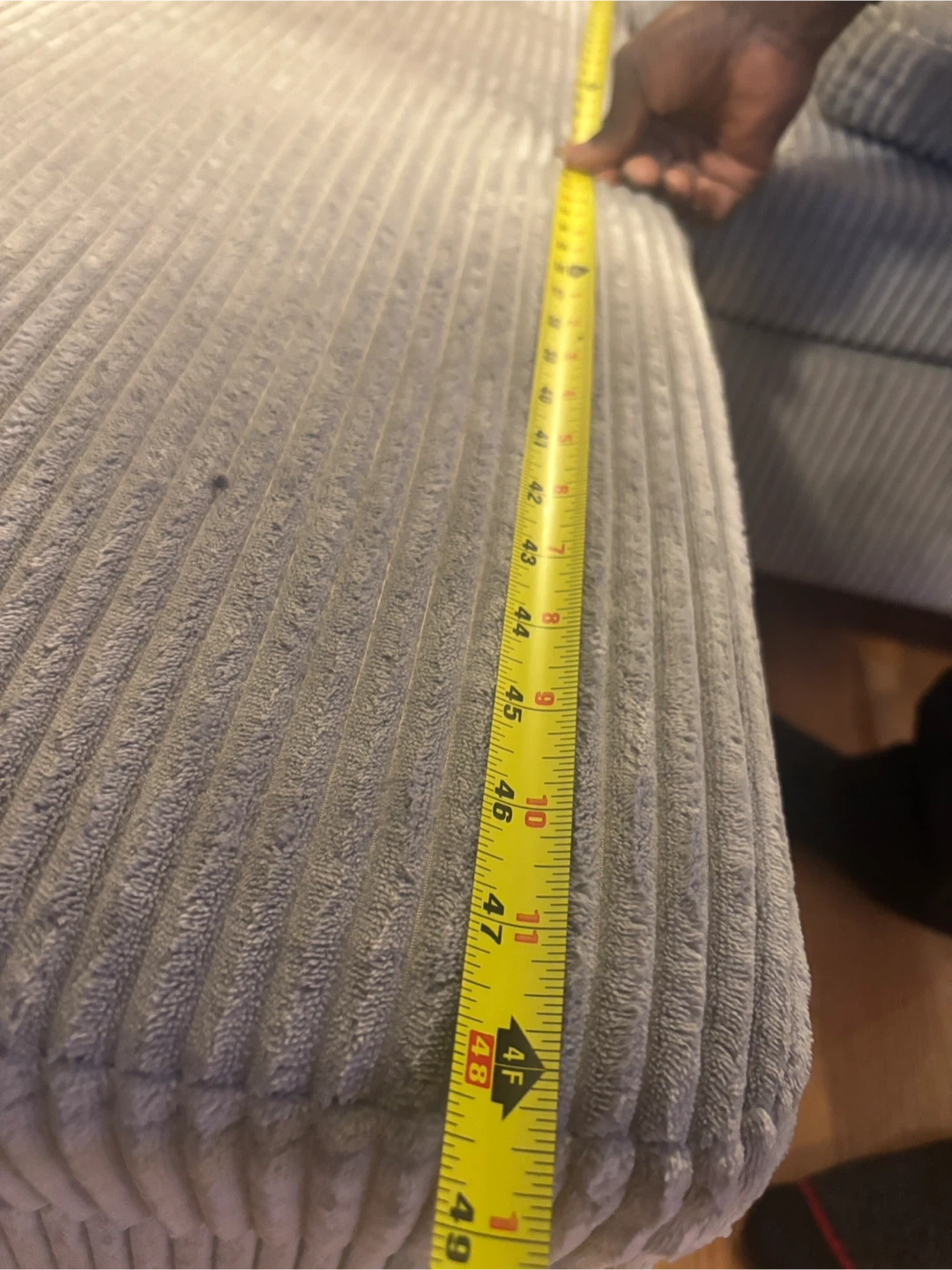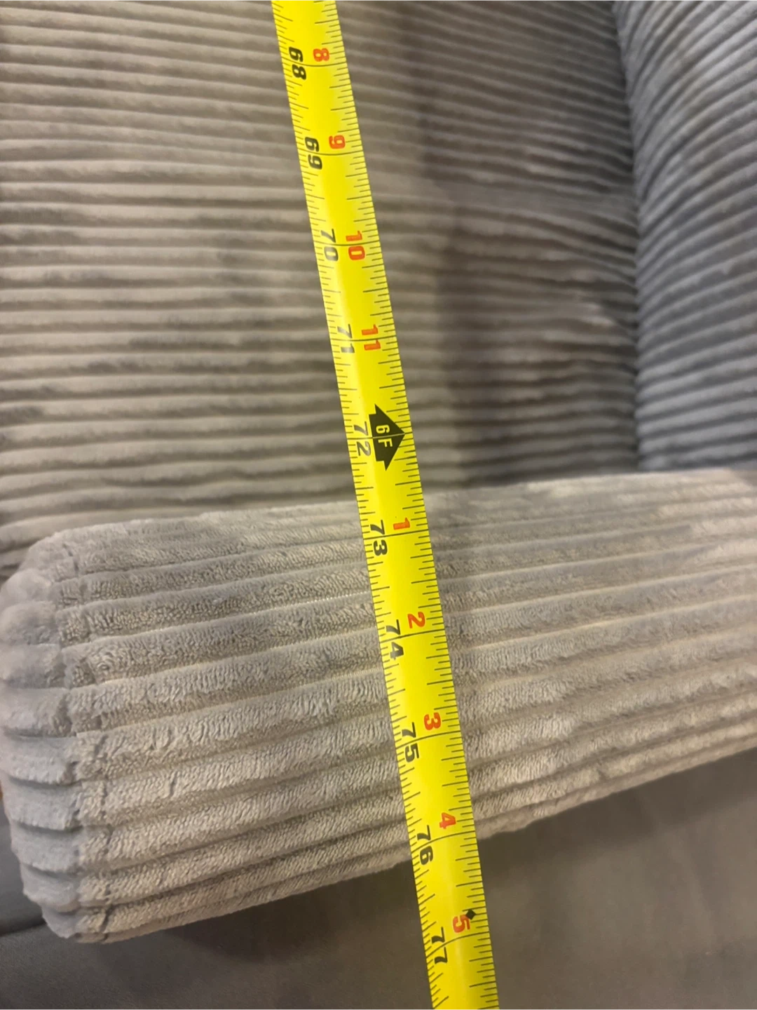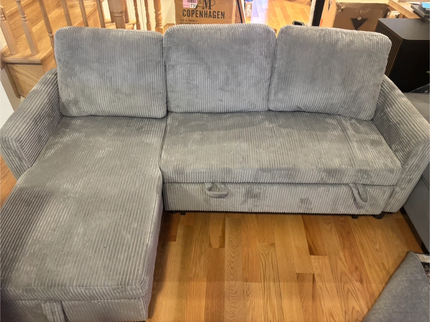 This comfy grey corduroy pull out sectional sofa offers ample seating. It features hidden storage within the chaise and under the main seating area. The fabric's ribbed texture adds a nice touch.available for delivery and pickup