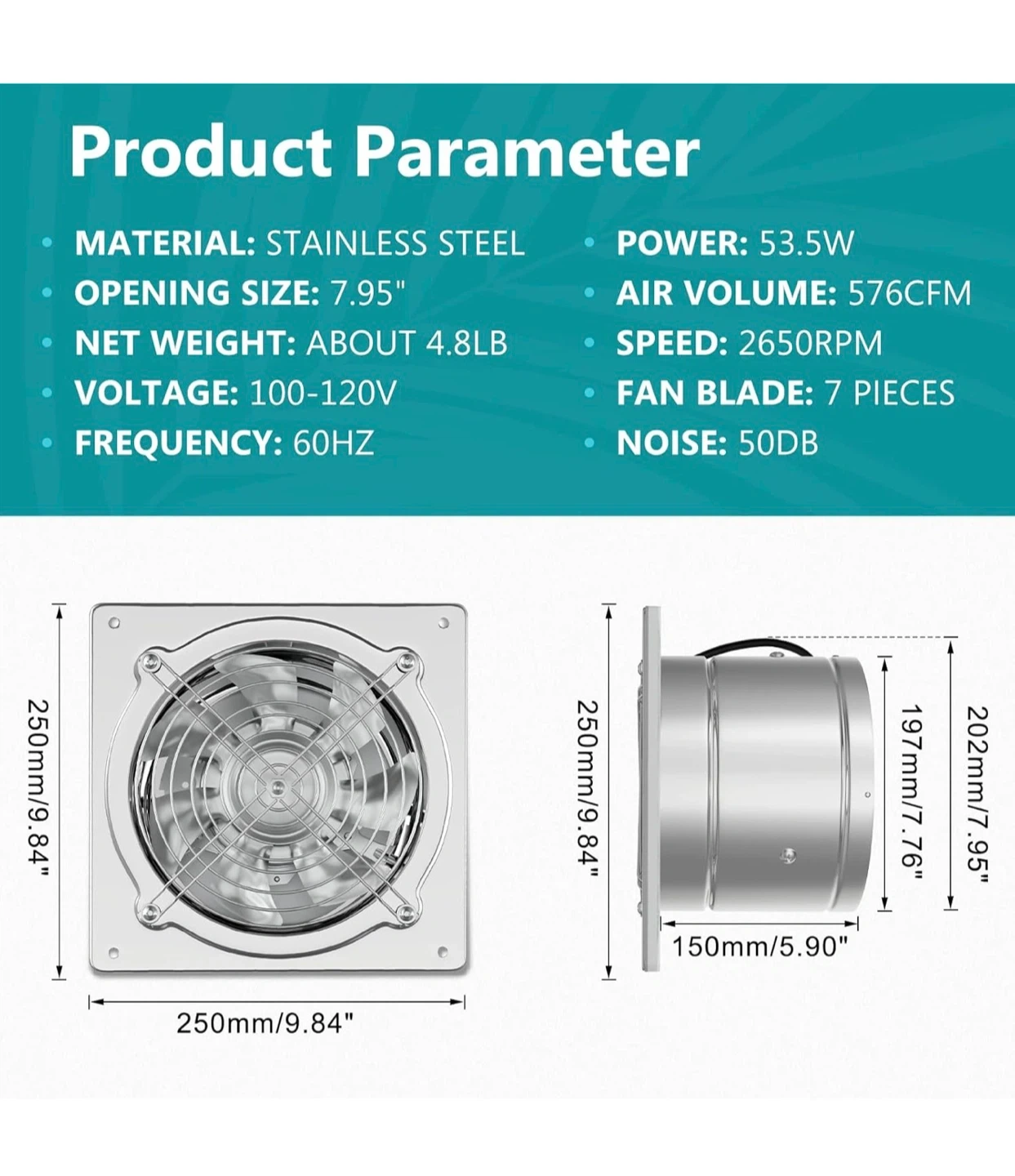 This is an 8-inch HG Power exhaust fan with a backdraft damper. It's made of stainless steel and operates at 576 CFM with 7 fan blades. The fan has a noise level of 50dB.