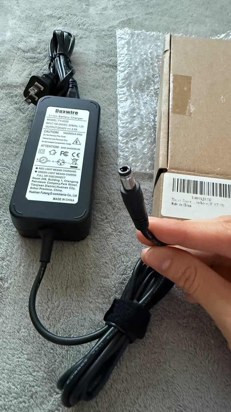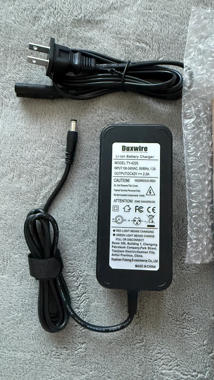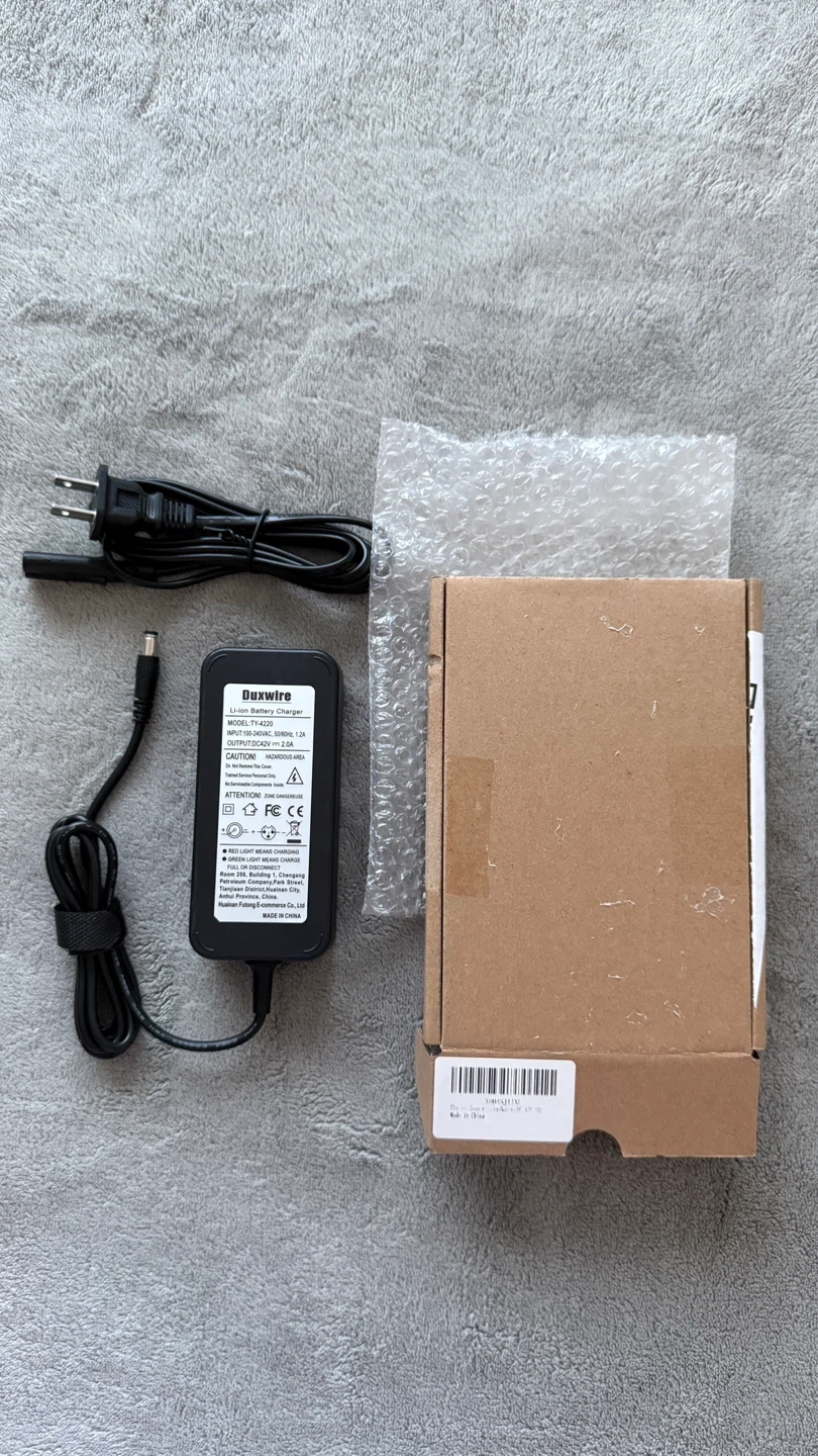 A brand-new Duxwire Li-ion Battery Charger, specifically designed for 36V Lithium-ion battery packs commonly used in electric scooters, e-bikes, and hoverboards.