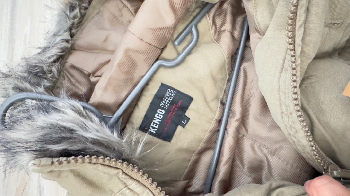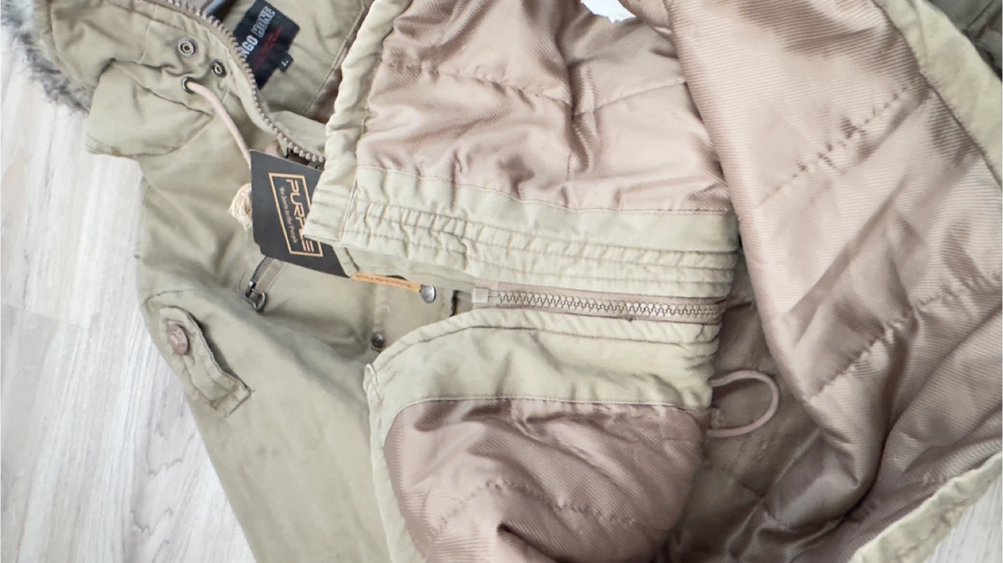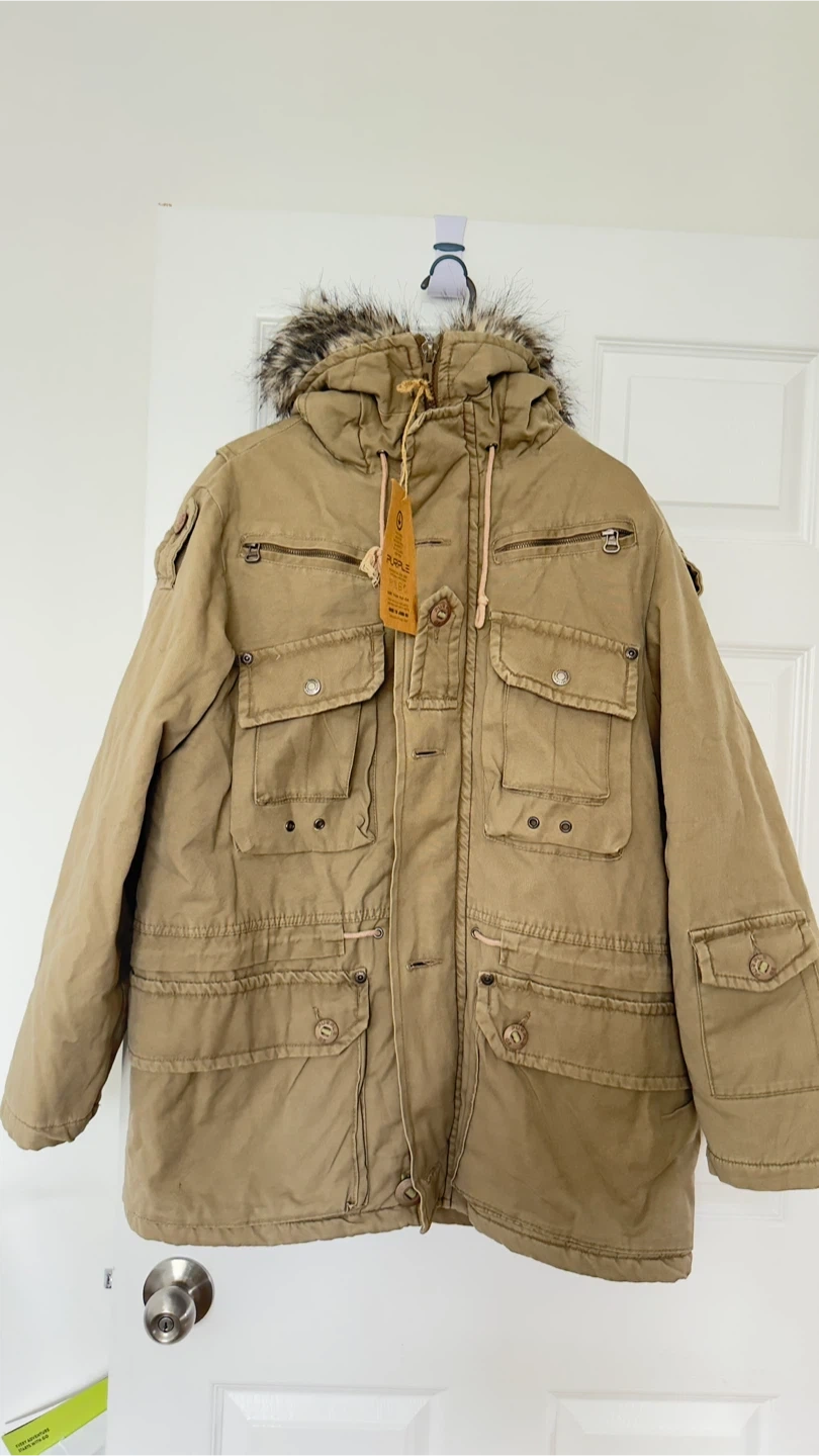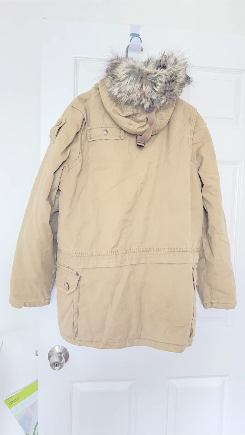 This men's parka jacket from Kengo Hone is in a khaki colour and features a faux fur trimmed adjustable hood. It's a size large with multiple pockets. Made from 100% cotton.it has tag on