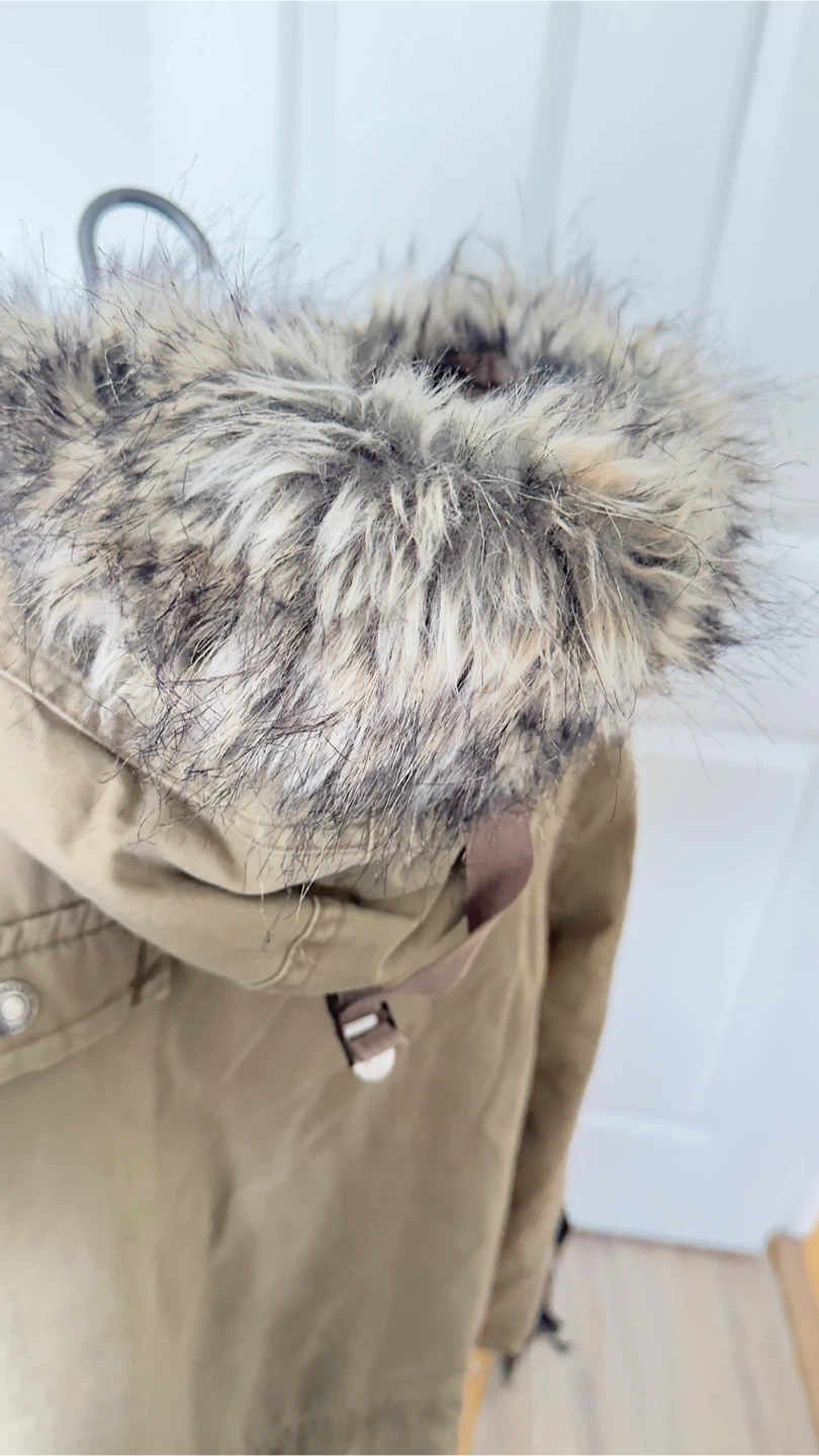 This men's parka jacket from Kengo Hone is in a khaki colour and features a faux fur trimmed adjustable hood. It's a size large with multiple pockets. Made from 100% cotton.it has tag on