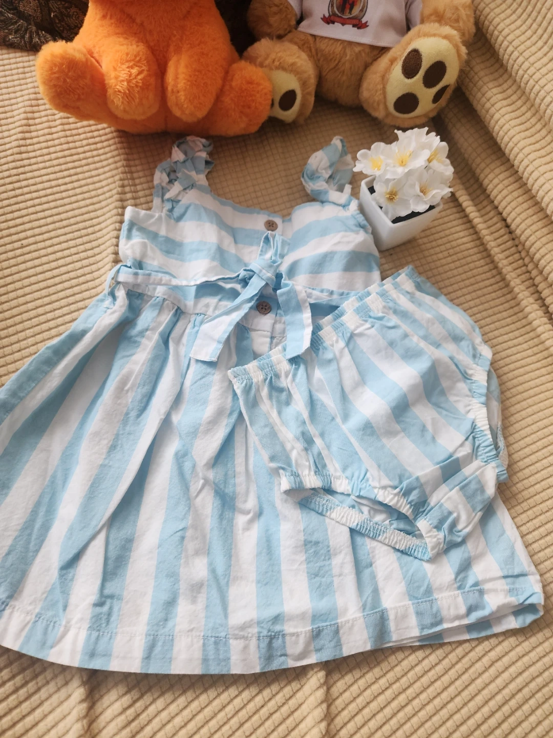This adorable blue and white striped dress comes with matching bloomers. It's made from soft cotton, perfect for warm weather. The set features a tie-front detail and ruffle sleeves.