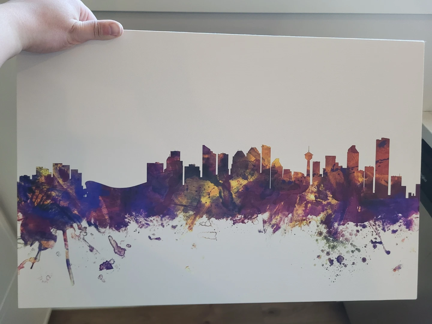 This canvas art features a watercolour-style depiction of the Calgary skyline. The print uses vibrant purple, yellow, and orange hues against a white background. It's a striking piece to liven up any wall!