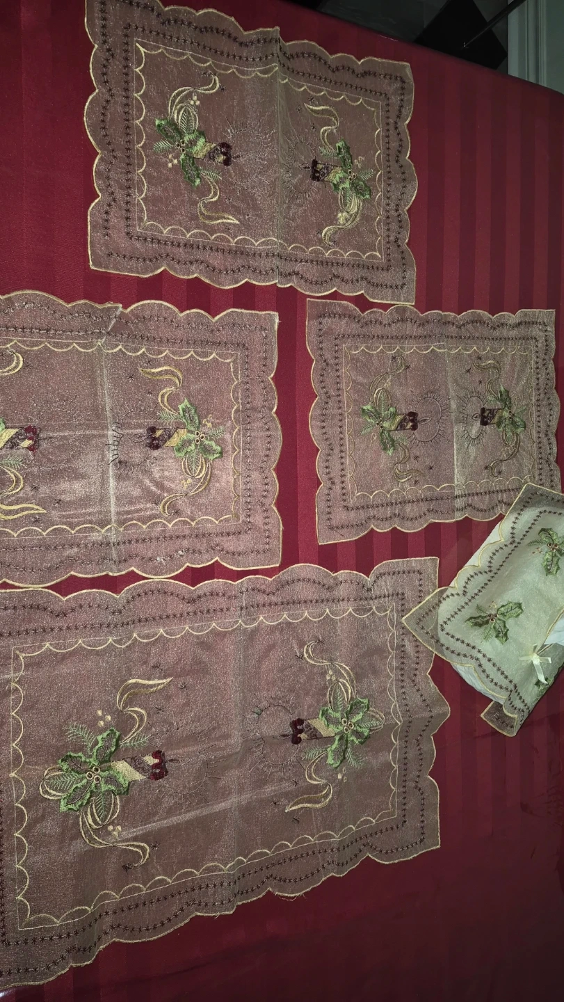 Selling a set of four embroidered Christmas coffee tables clothes with tissue box cover. Perfect for adding a festive touch this season!