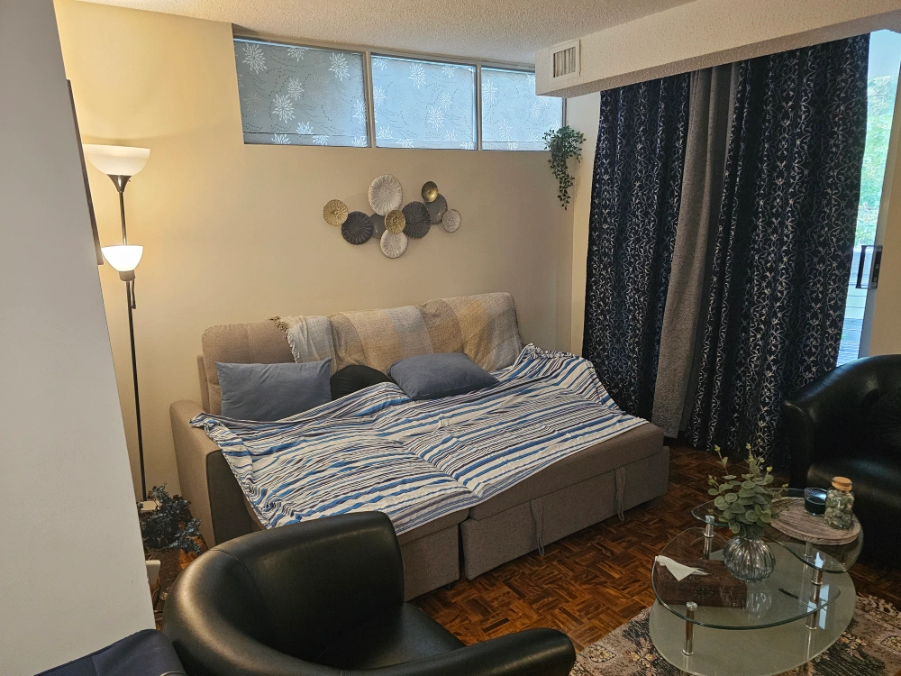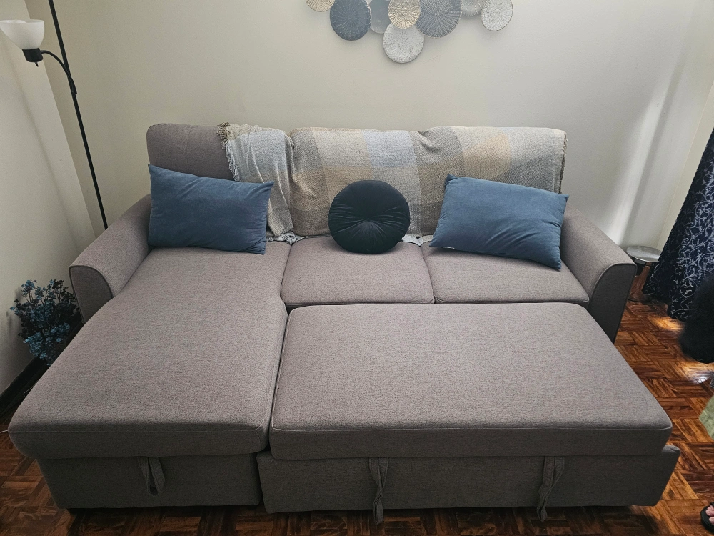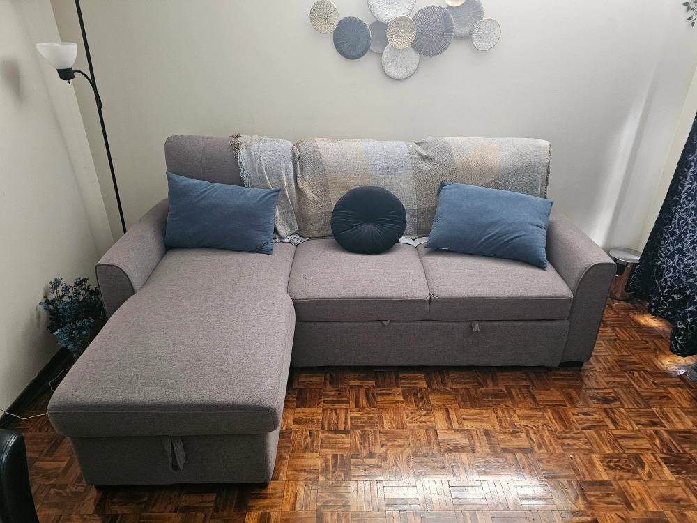 This sofa can be used as a sectional couch or as a pull-out bed. It comes with four pillows and has a pull-out bed that can be used as a single or double bed. This sofa is in good condition and has been well-maintained. It has been used for a few years but has always been covered with a blanket to keep it clean. It is a great size and is perfect for a living room, den, or guest bedroom.