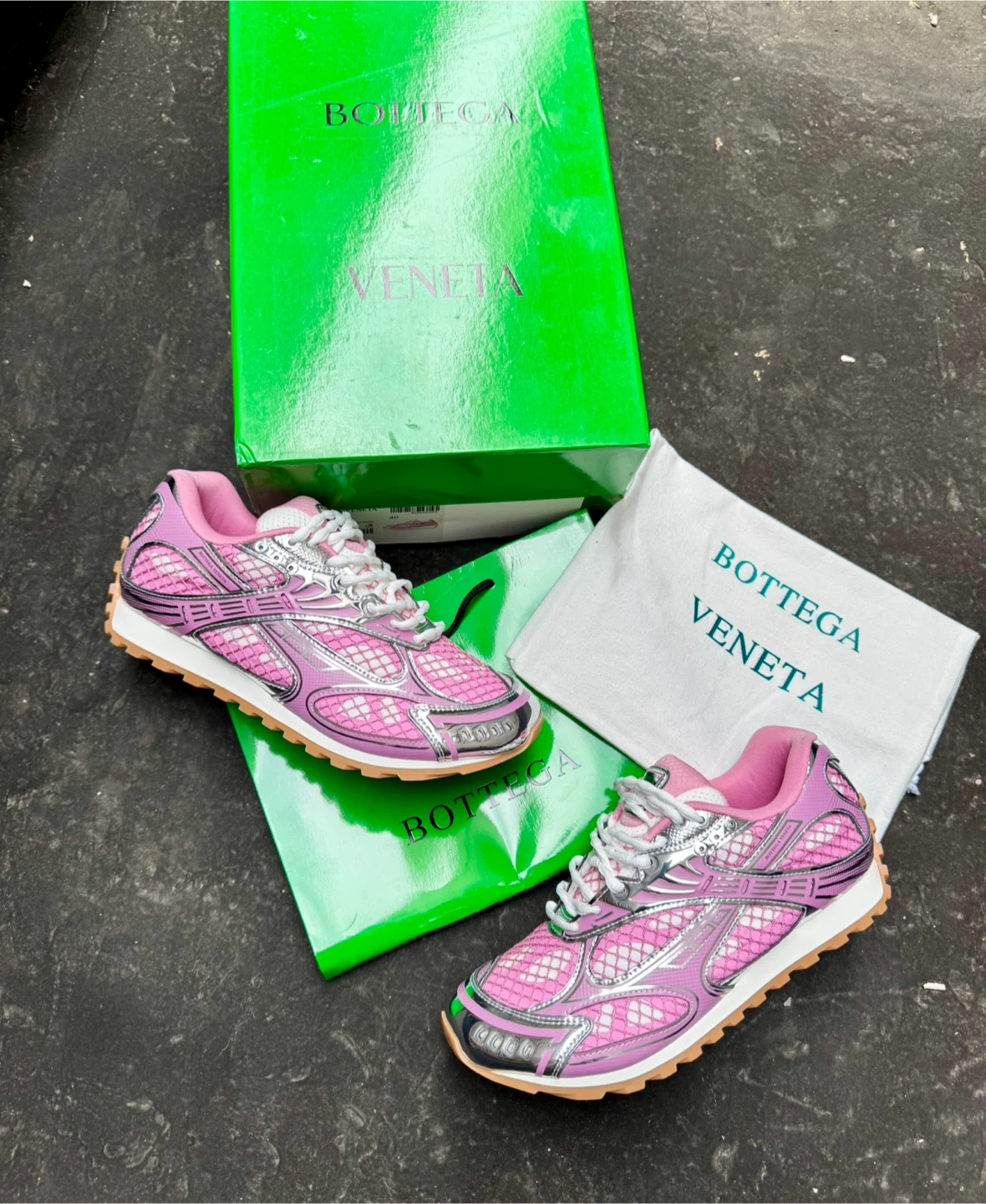 These are Bottega Veneta mesh runner sneakers in a vibrant pink and silver colorway. They come with the original box and dust bag. Features include a lace-up closure and a durable rubber sole.