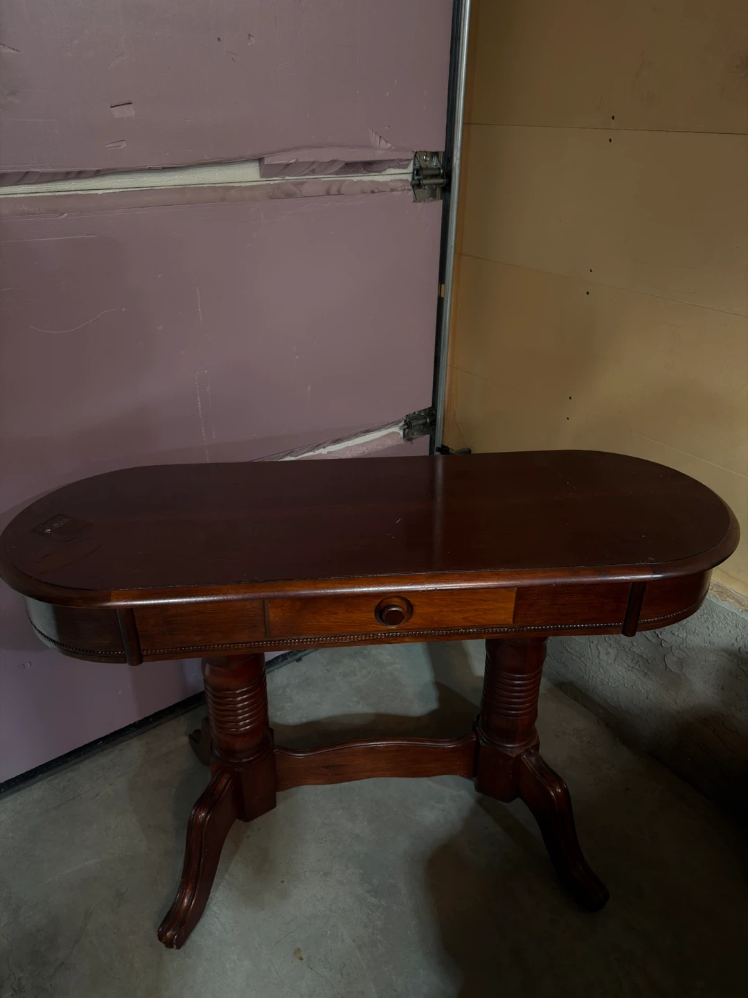 Here's a lovely antique oval accent table. It features a rich, dark wood finish and a charming drawer with a round knob. The legs have a unique, carved design that adds to its vintage appeal. Perfect for adding a touch of classic elegance to any room.