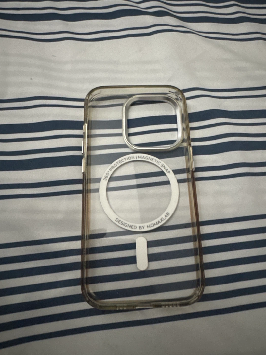 This is a clear protective phone case with magnetic snap functionality. It's designed by MOMAXLAB for 360° protection. The case is made from a durable material.
