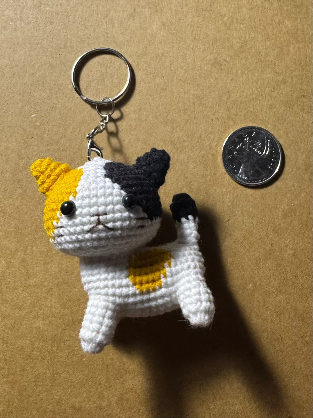 A cute crocheted keychain designed to look like a calico cat. It's made from yarn with white, black, and yellow colours. This makes a fun accessory for your keys or bag!