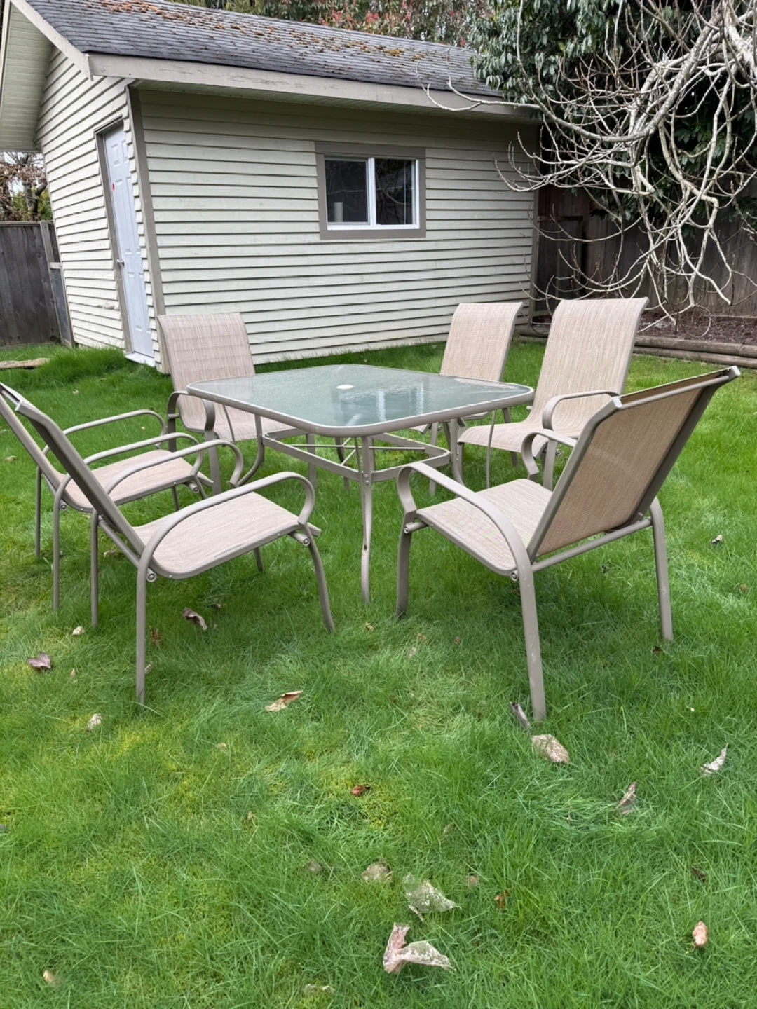 7 piece patio dining set with a glass-top table and six chairs. Chairs are made with a durable frame and fabric seating. This set is great for enjoying meals outdoors or relaxing on your deck.