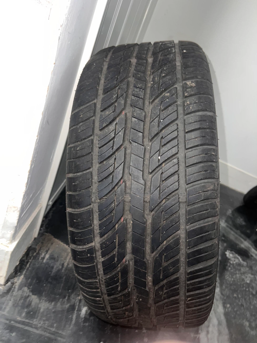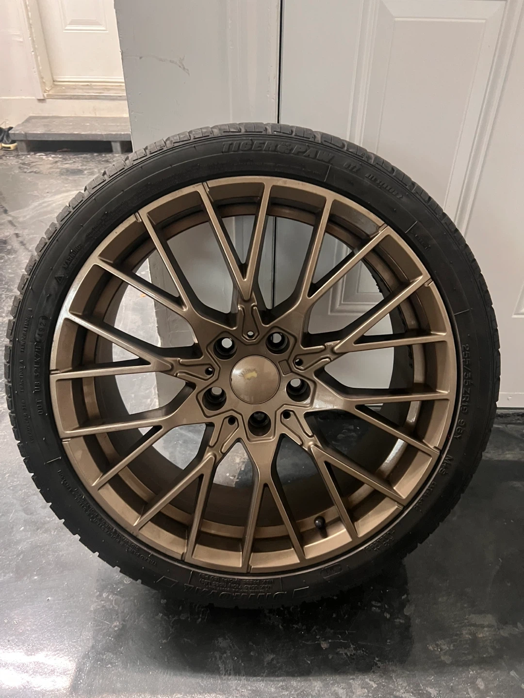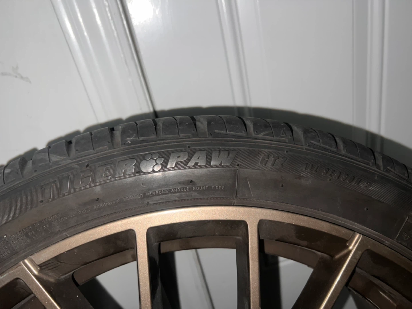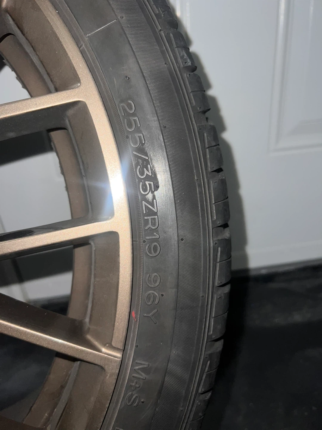 4 Bronze aftermarket wheel with a tire. Tire size is 255/35ZR19 96Y. This wheel would be useful as a replacement or for a custom setup. Bolt pattern 5x120, tires only used for 1 season