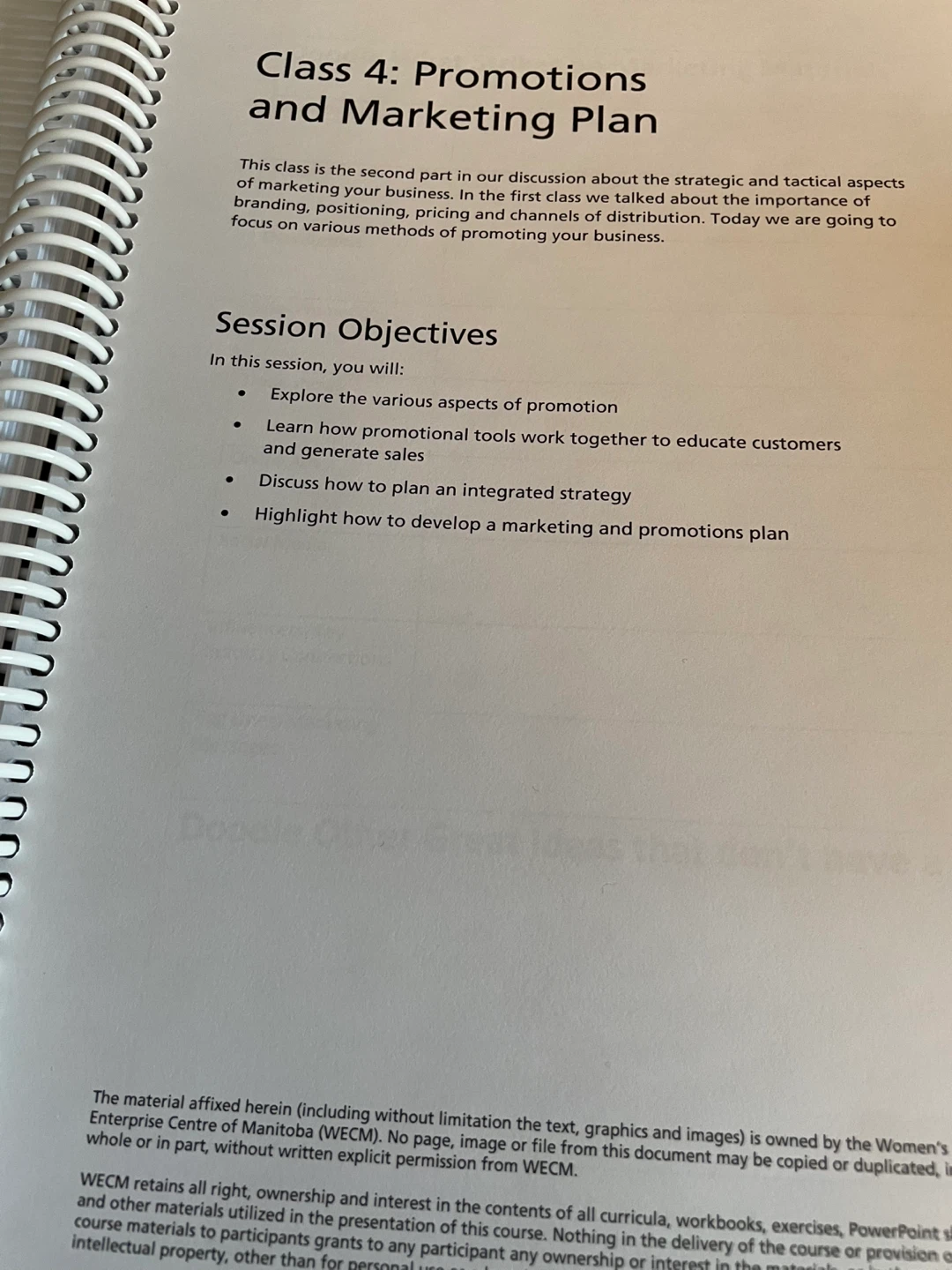 This workbook covers Class 4: Promotions and Marketing Plan, Business Plan Development, Developing a Risk Analysis and Contingency Plan, Market Research, and Marketing and much more . Includes content on strategic aspects, session objectives, and practical examples.
