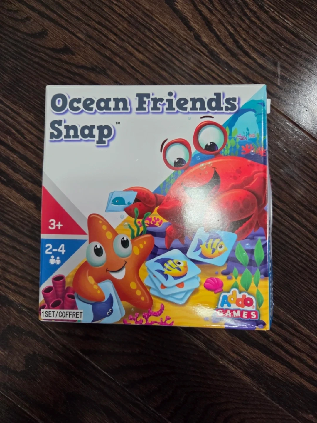 This is the Ocean Friends Snap card game by Addo Games. It's designed for 2-4 players and recommended for ages 3 and up. The game includes one set of cards for matching fun!