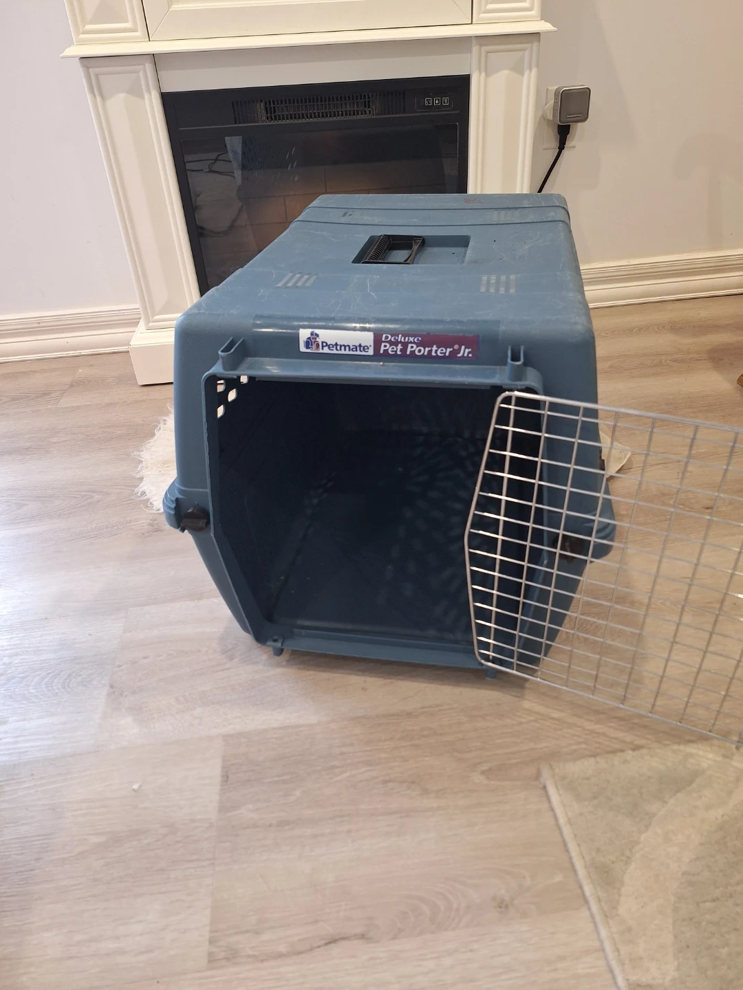 This is a blue Petmate Deluxe Pet Porter Jr. carrier. It features a metal door and vents for airflow. Suitable for small pets for travel or transport.