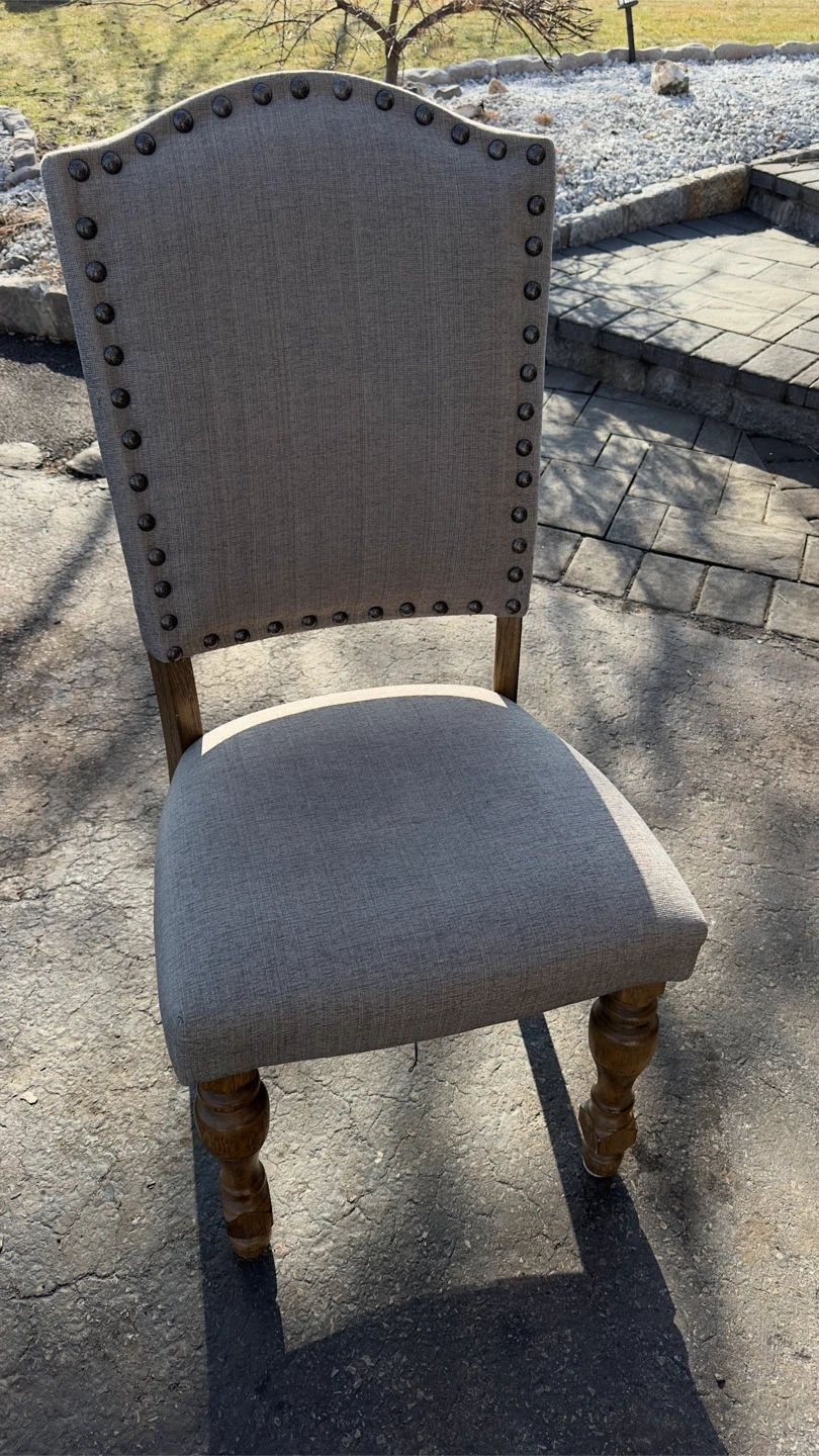 This upholstered dining chair features a classic design with decorative nailhead trim. Its neutral fabric and turned wooden legs complement various decor styles. It's a sturdy piece for your dining room or accent seating. $45 each chair.