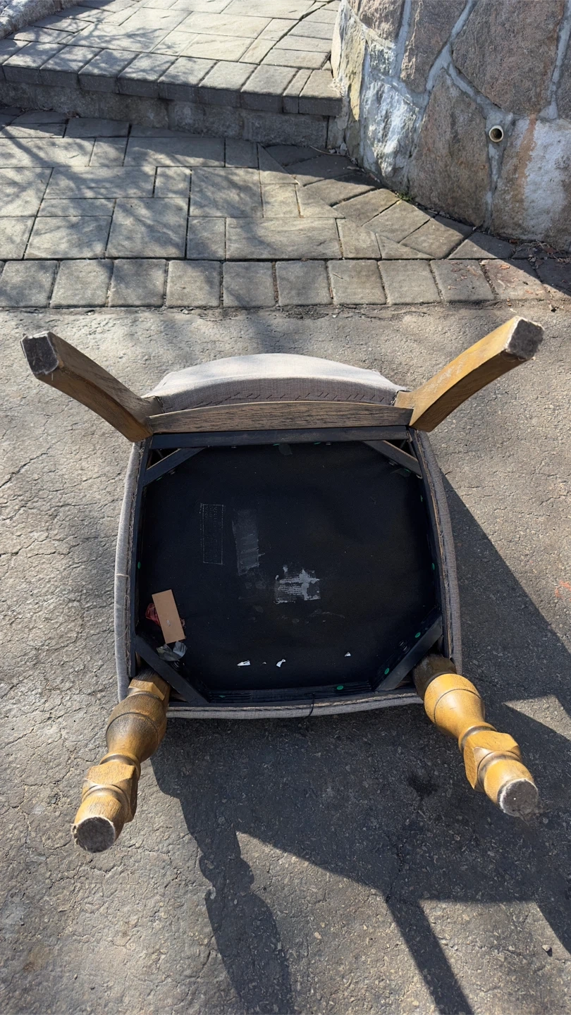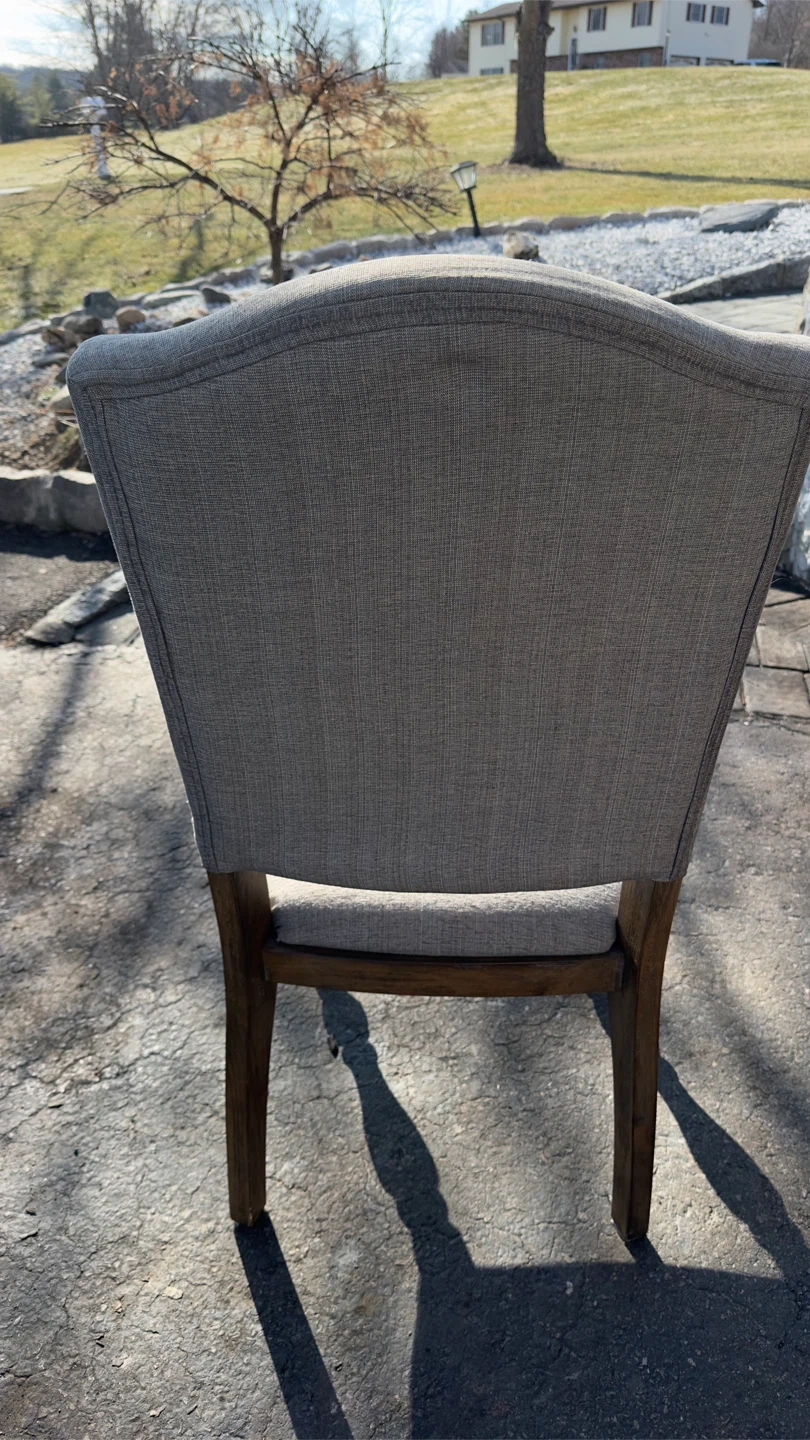This upholstered dining chair features a classic design with decorative nailhead trim. Its neutral fabric and turned wooden legs complement various decor styles. It's a sturdy piece for your dining room or accent seating. $45 each chair.