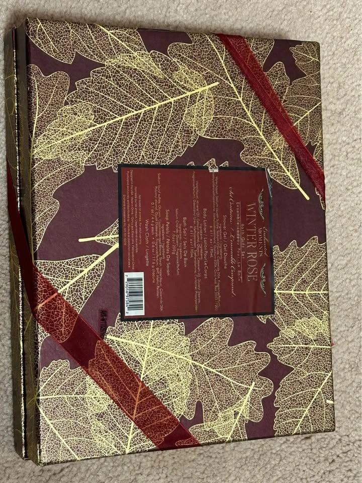 New bath gift set from Enchanted Moments. Winter Rose scent. Includes shower gel (6.4 fl.oz), body lotion (6.4 fl.oz), bath salt (7.0 oz), soap petals (0.6 oz), and a wash cloth. All items are new in original packaging and unopened.