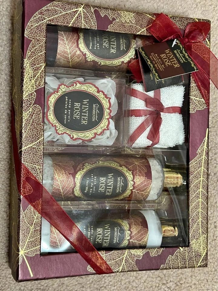 New bath gift set from Enchanted Moments. Winter Rose scent. Includes shower gel (6.4 fl.oz), body lotion (6.4 fl.oz), bath salt (7.0 oz), soap petals (0.6 oz), and a wash cloth. All items are new in original packaging and unopened.