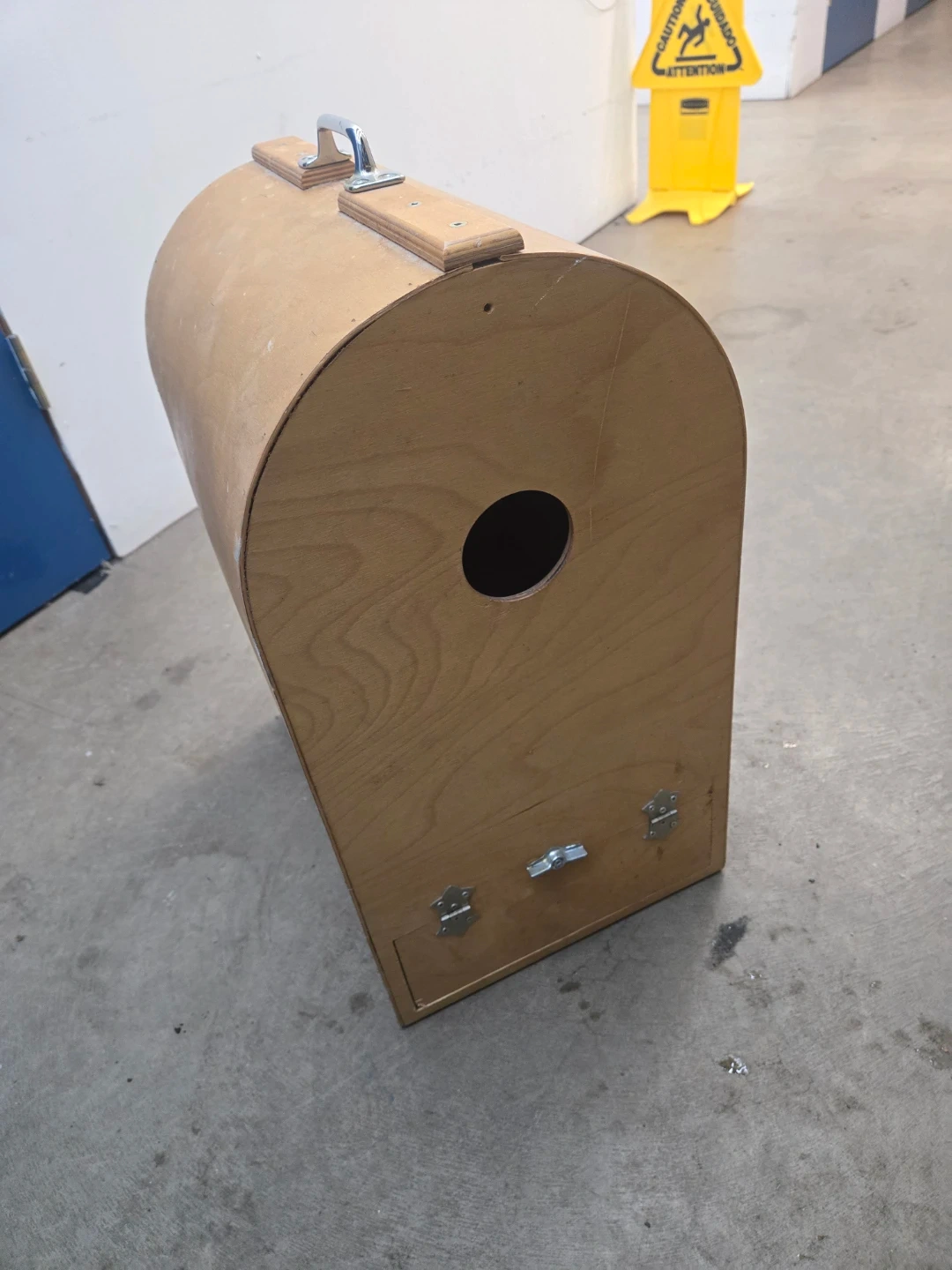 This is a unique, handmade wooden carrier with a rounded top and a carrying handle. It features a circular opening on the front and small latches on the bottom panel. It's a durable and portable option for transporting small animals. Measures approximately 18 inches tall and 14 inches wide.