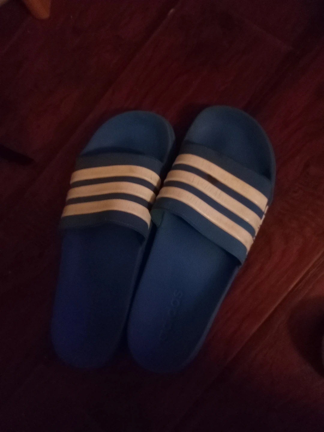 Blue Adidas slides featuring the iconic three white stripes across the strap. These slides are made of a durable synthetic material. Comfortable for casual wear.