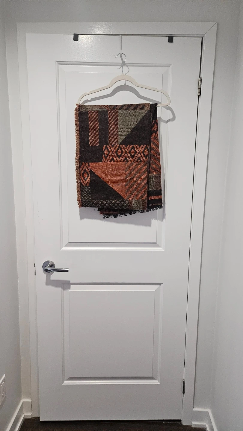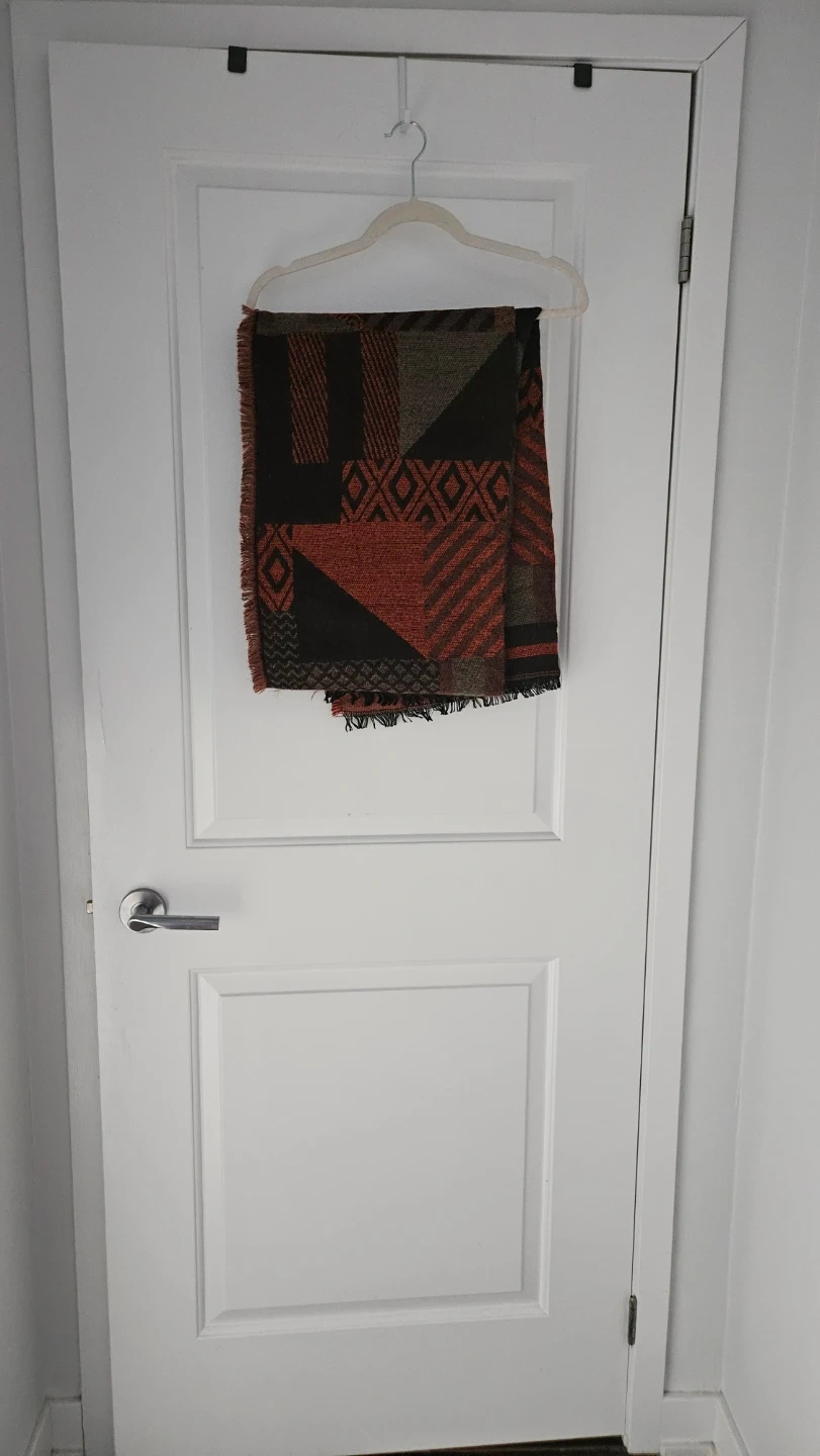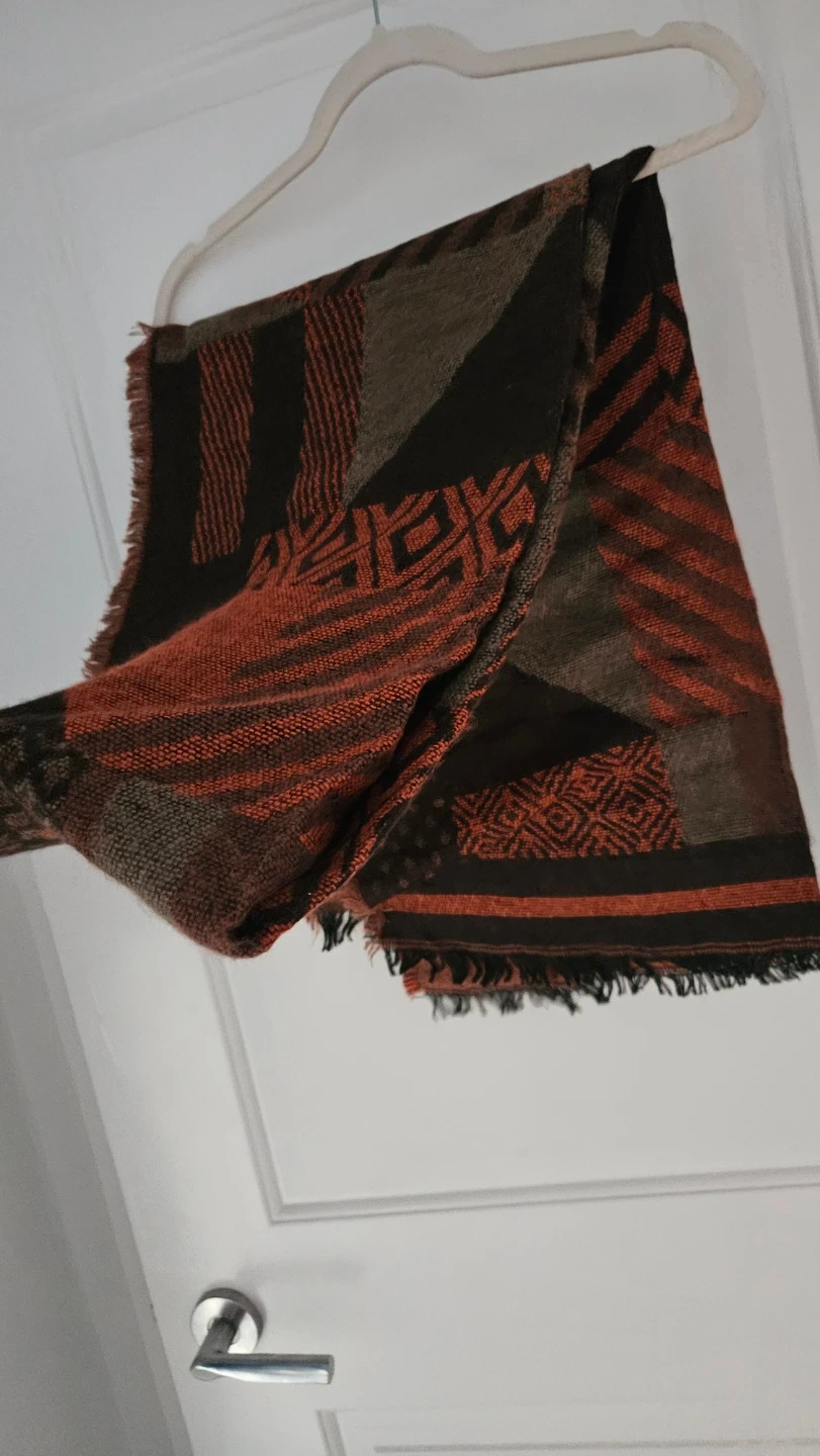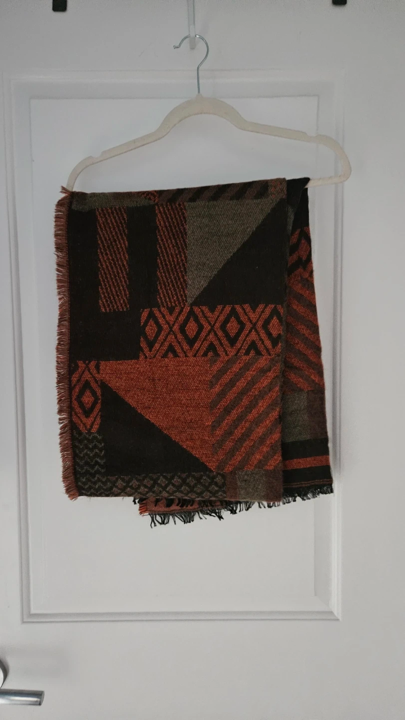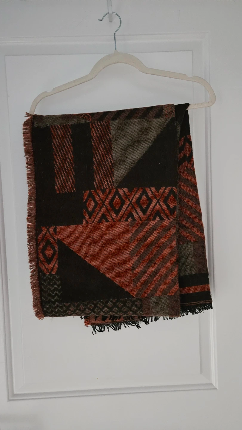 This scarf features a bold geometric pattern with burnt orange, brown, and olive green accents. It has fringed edges for a classic look. It's a cozy accessory for cooler weather!