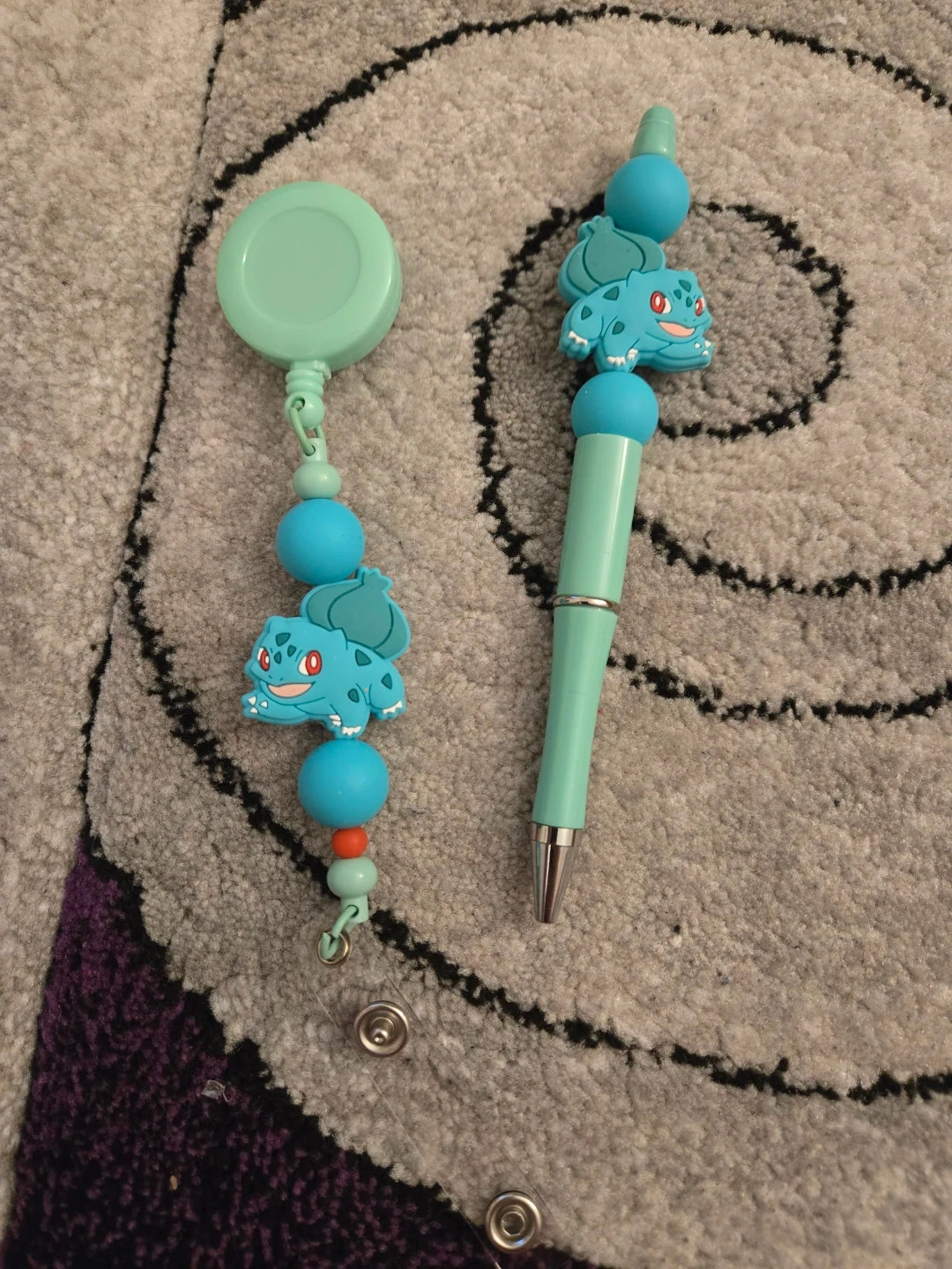 This set includes a retractable badge reel and a pen, both featuring Bulbasaur from Pokemon. The badge reel is teal with blue beads and a Bulbasaur charm. The pen is also teal with blue beads and a Bulbasaur charm. They're great for fans!